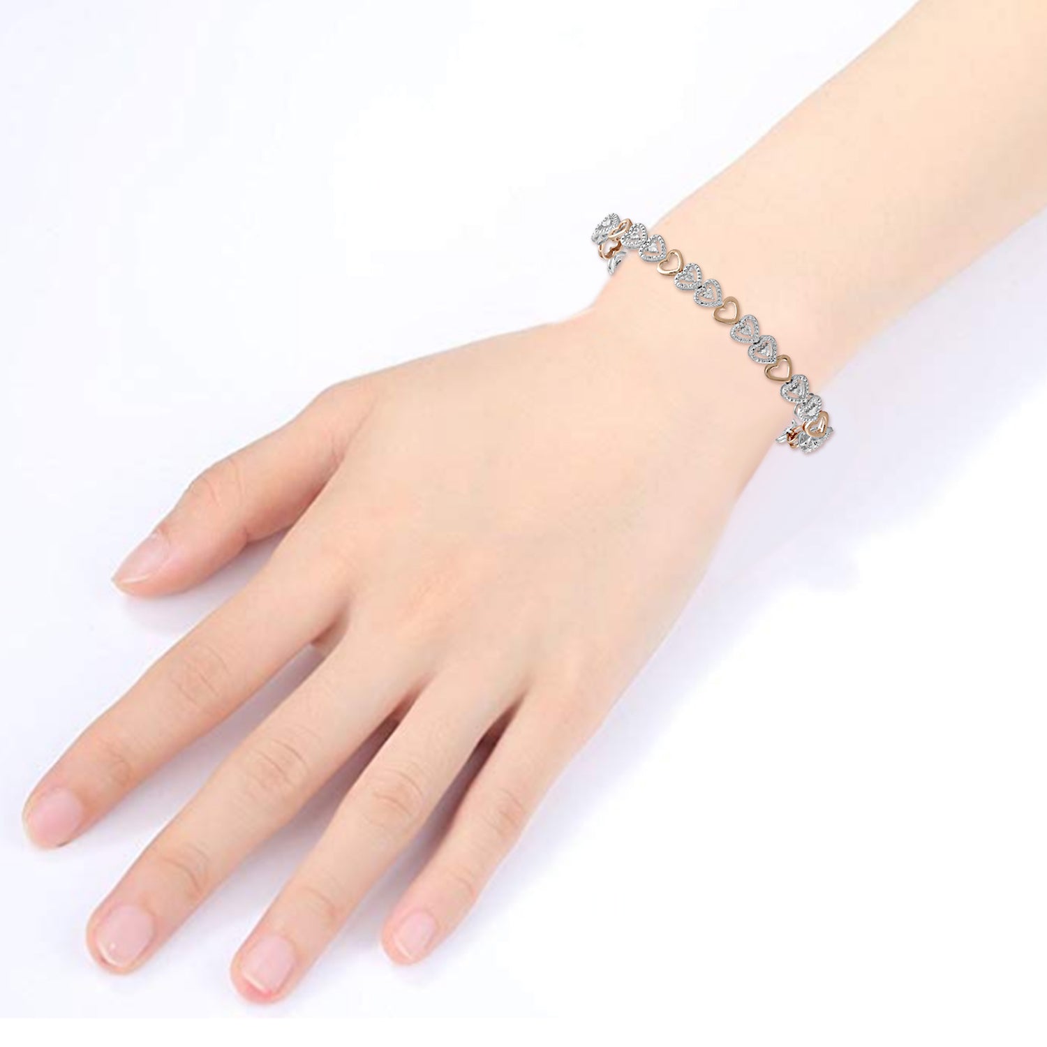 • 14K Rose Gold Over Brass Heart Miracle Plated White Diamonds Link Bracelet