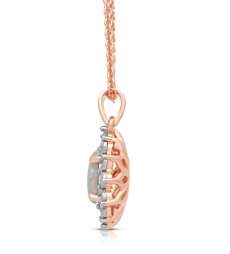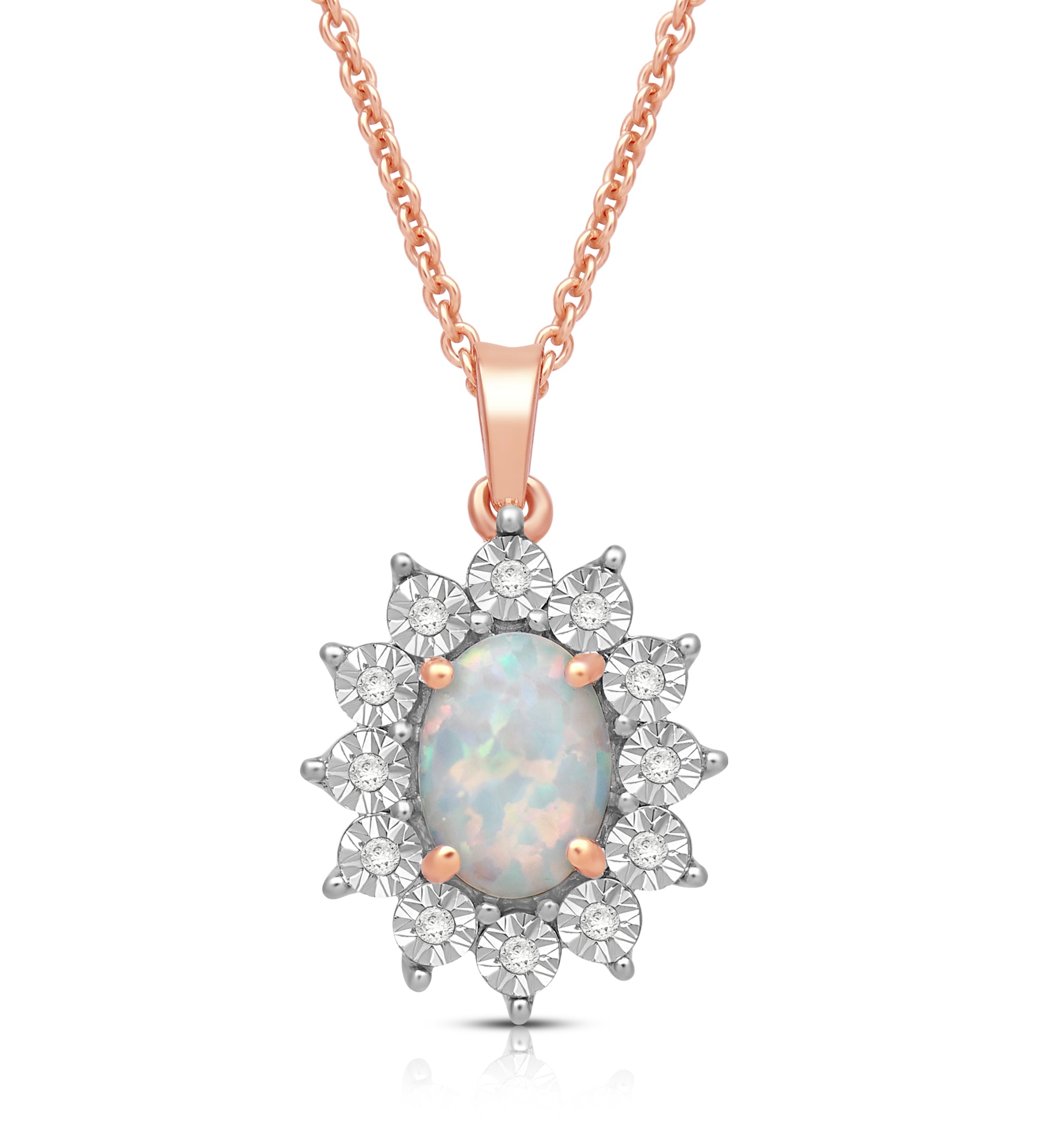 Jewelili 14K Rose Gold over Sterling Silver 7x5 MM Oval Cut Created Opal and 1/20 Cttw Natural White Round Diamond Halo Pendant Necklace