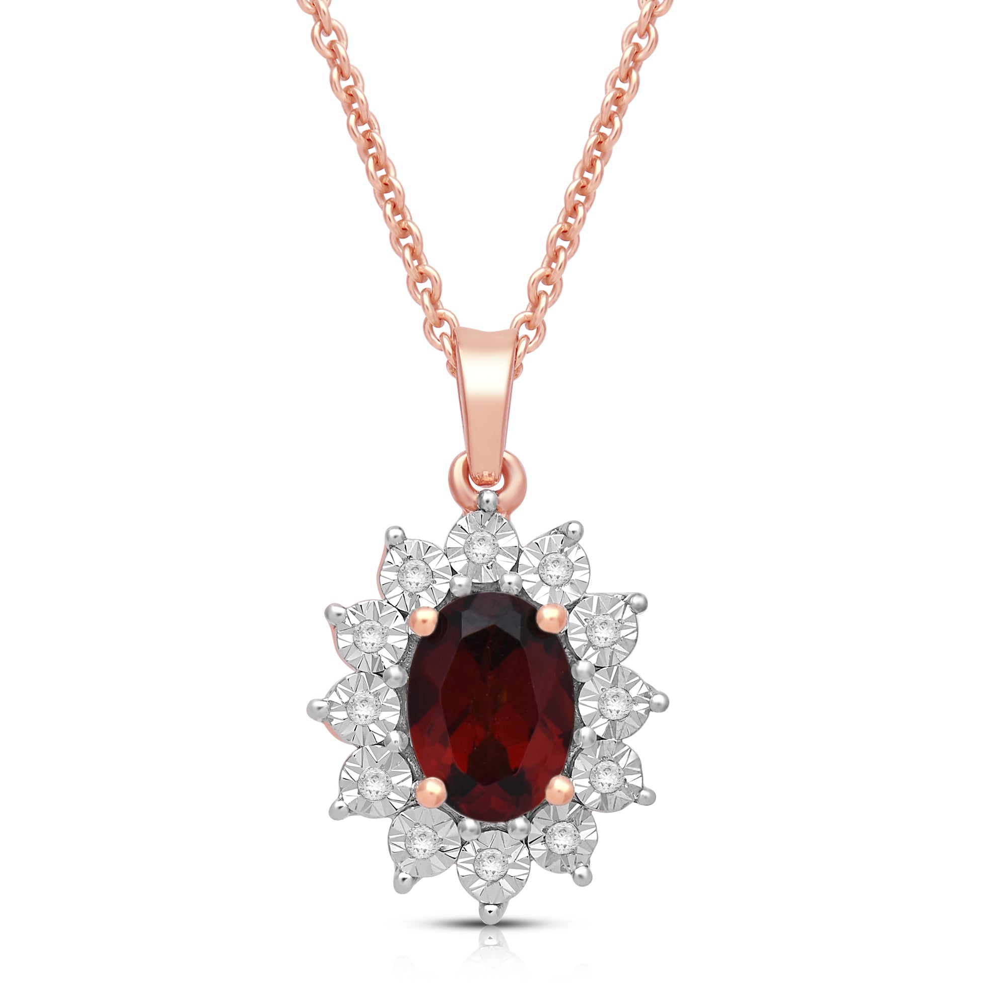 Jewelili 14K Rose Gold over Sterling Silver 7x5 MM Oval Genuine Garnet and 1/20 Cttw Natural White Round Diamond Pendant Necklace