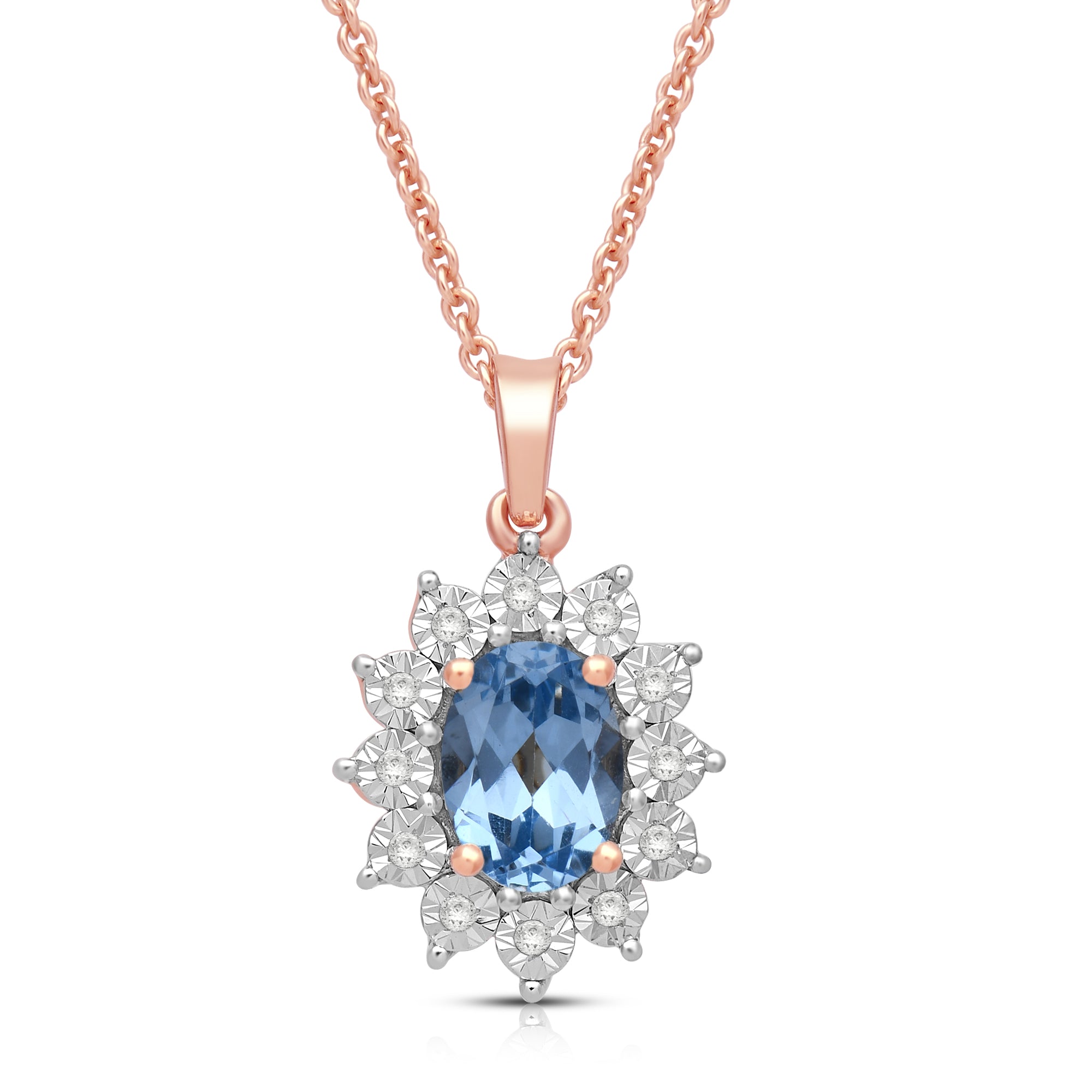 Jewelili 14K Rose Gold over Sterling Silver 7x5 MM Oval Genuine Swiss Blue Topaz and 1/20 Cttw Natural White Round Diamond Pendant Necklace