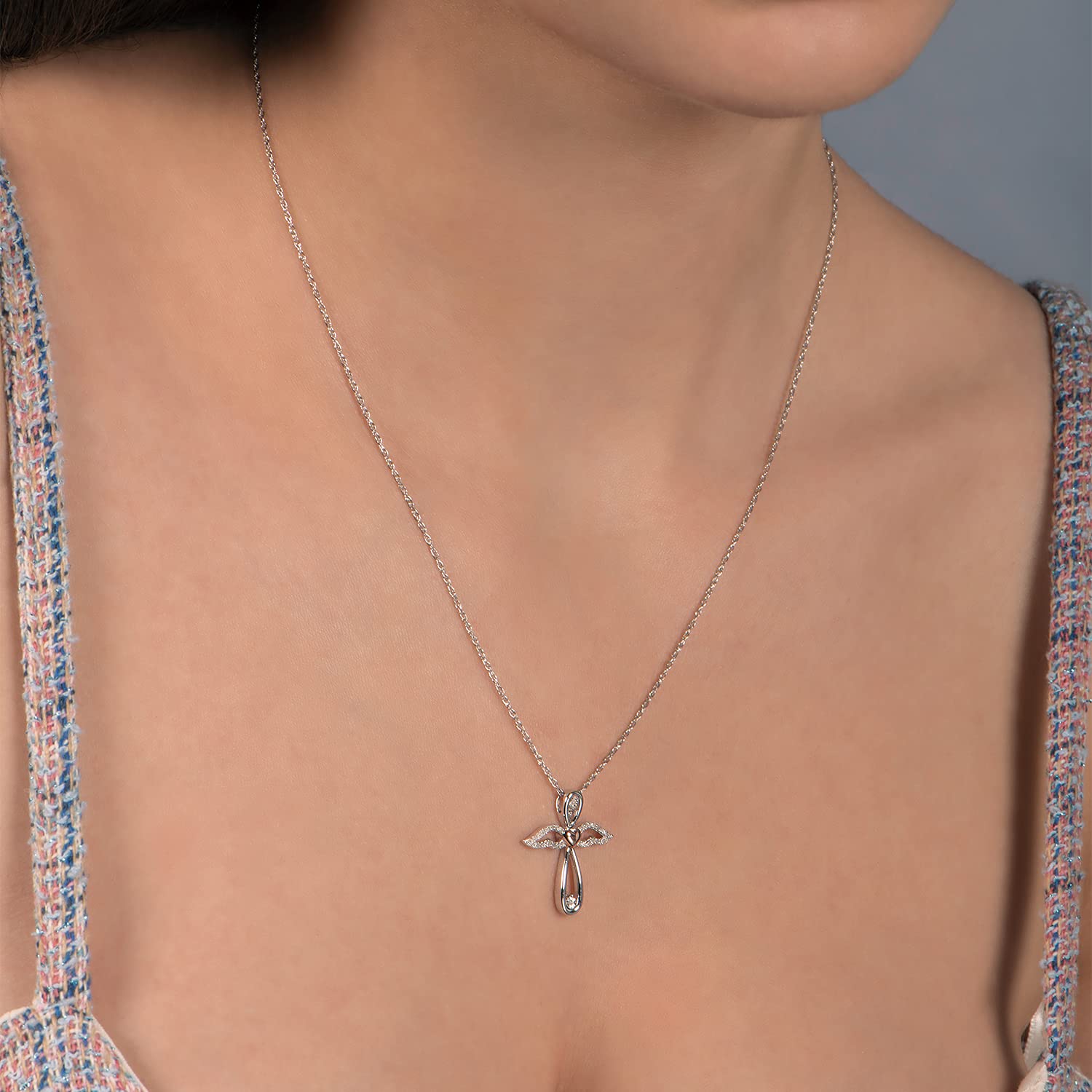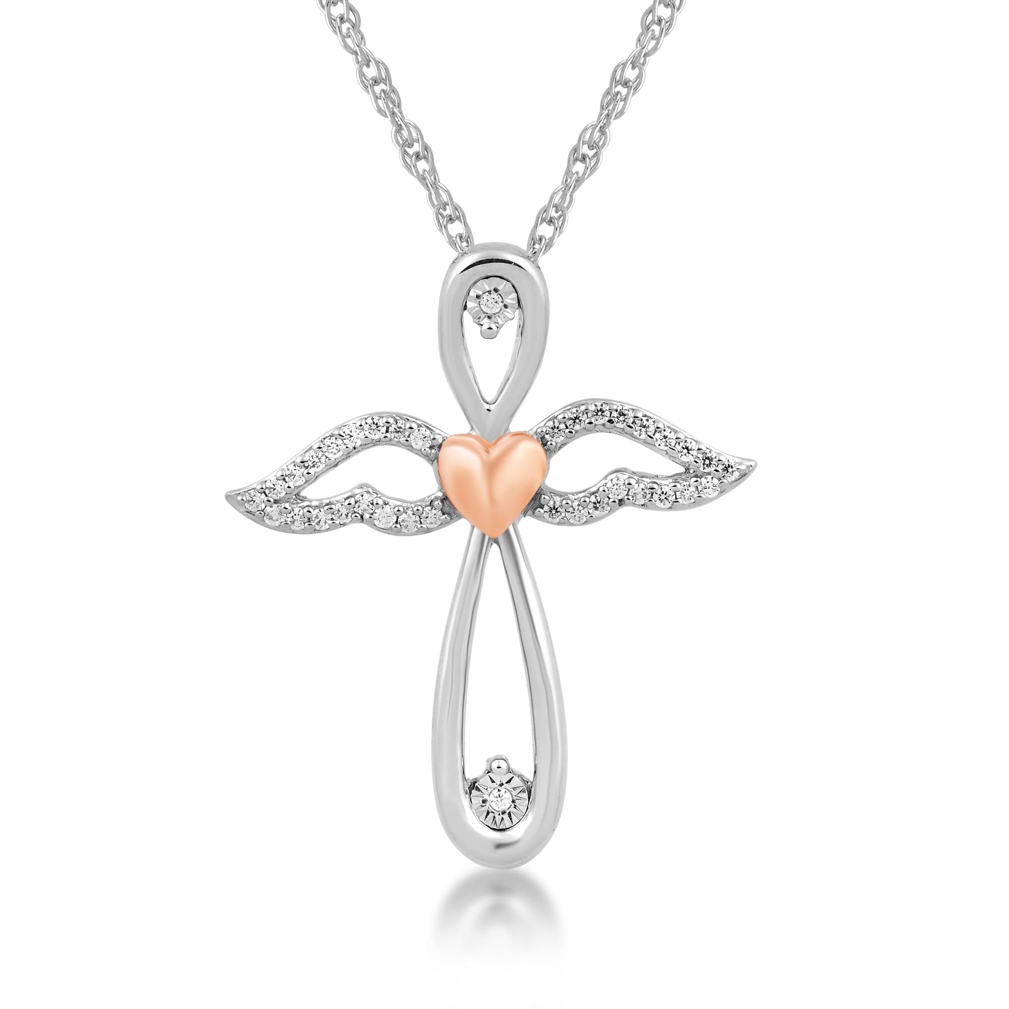 Details: 14K Rose Gold Over Sterling Silver With 1/10 Cttw Natural White Diamonds Angel Wing Cross Pendant Necklace