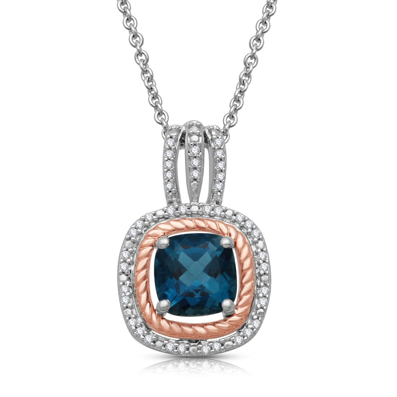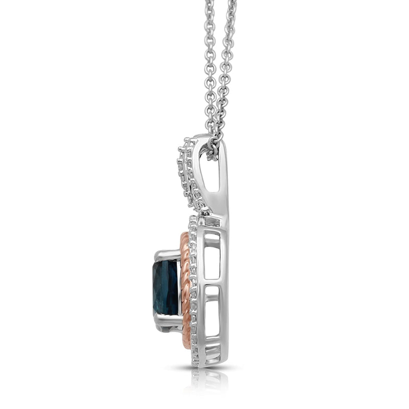 • 14K Rose Gold Over Sterling Silver With Simulated London Blue Topaz and 1/8 Cttw Natural White Diamonds Halo Pendant Necklace