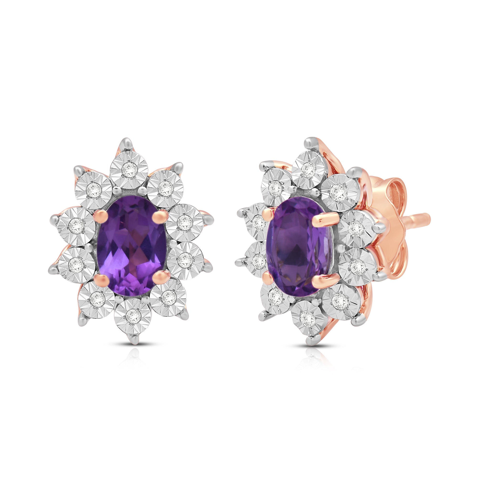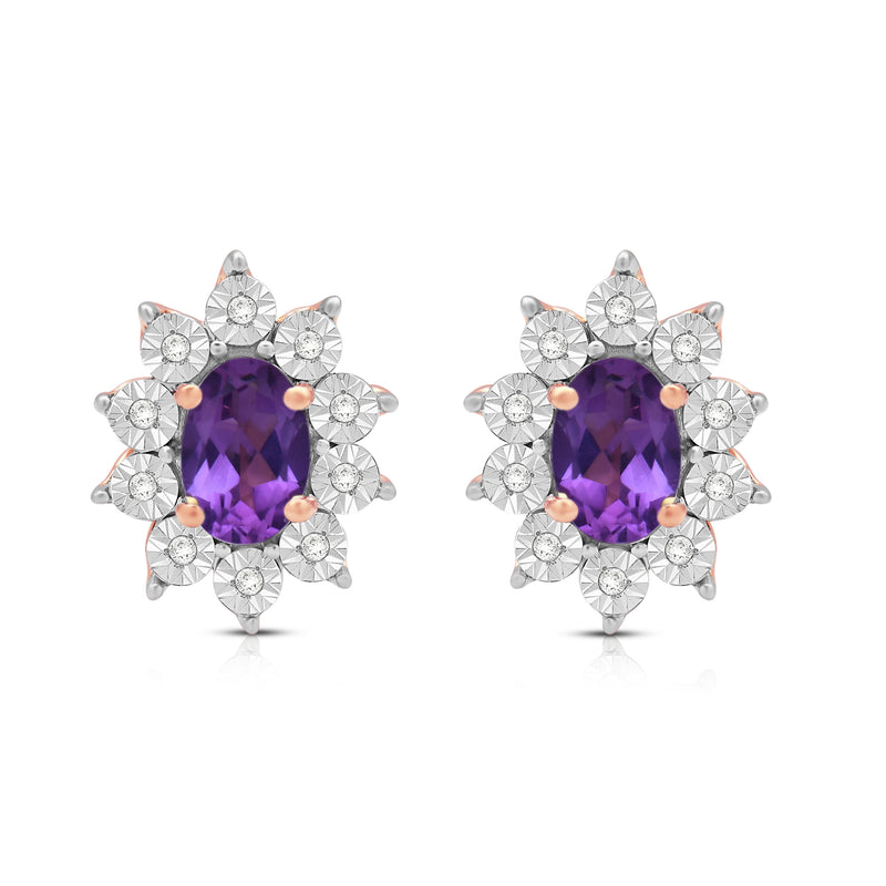 Elevate your style with our exquisite 14K Rose Gold over Sterling Silver cluster stud earrings. Each earring features a 6x4mm oval Created Amethyst gemstone, surrounded by a delicate cluster of 1/20 carat total weight natural white round Diamonds. The captivating blend of rose gold and sterling silver enhances the allure of these earrings, creating a luxurious and sophisticated look. These earrings are the perfect addition to any ensemble, adding a touch of elegance and brilliance to both formal occasions and everyday wear.
