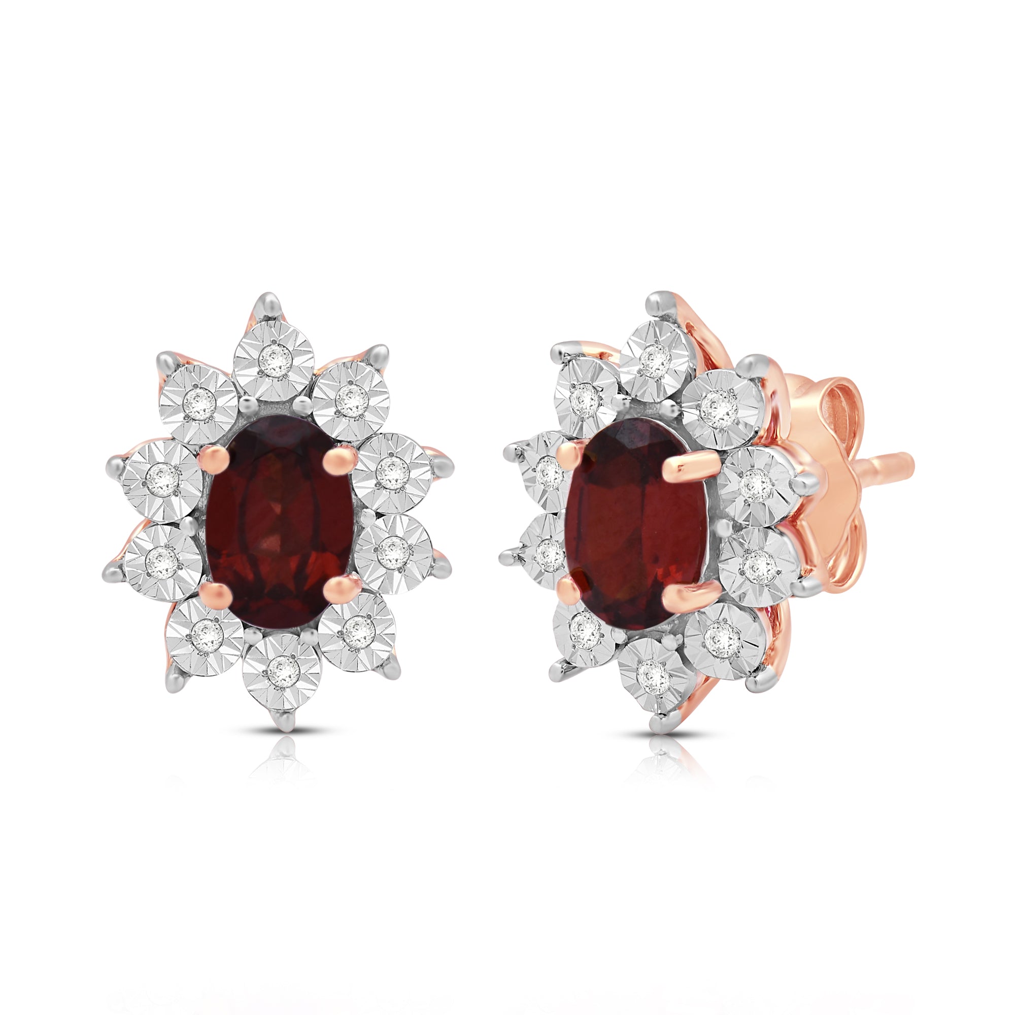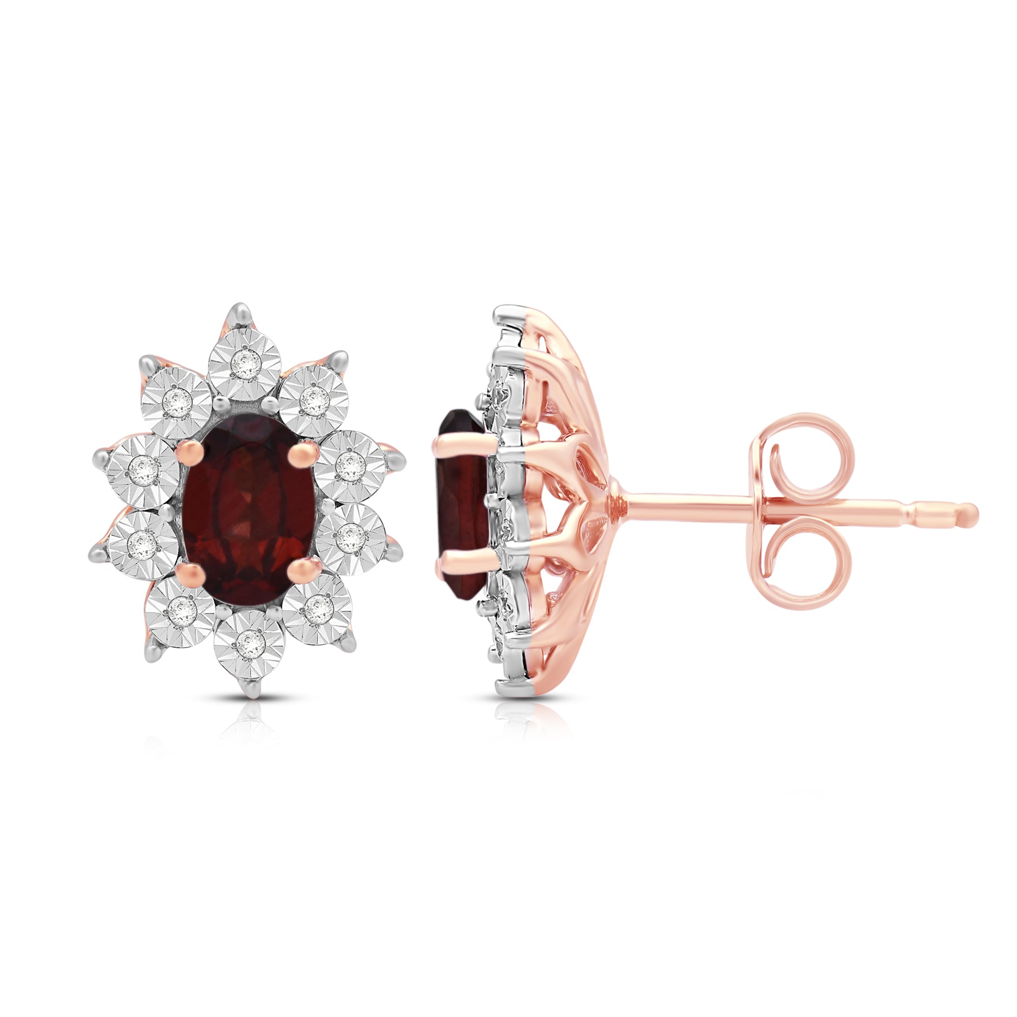 Elevate your style with our exquisite 14K Rose Gold over Sterling Silver cluster stud earrings. Each earring features a 6x4mm oval genuine Garnet gemstone, surrounded by a delicate cluster of 1/20 carat total weight natural white round Diamonds. The captivating blend of rose gold and sterling silver enhances the allure of these earrings, creating a luxurious and sophisticated look. These earrings are the perfect addition to any ensemble, adding a touch of elegance and brilliance to both formal occasions and everyday wear.