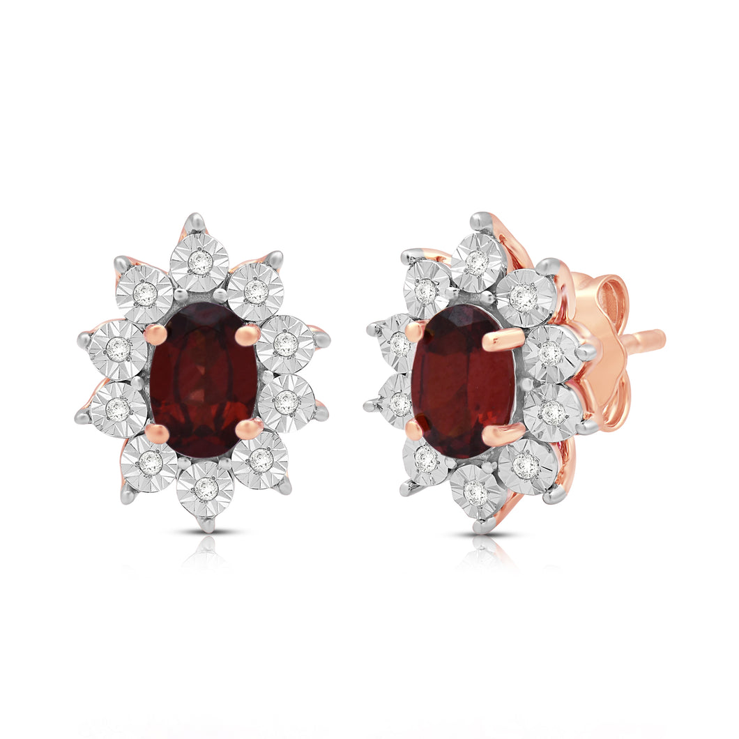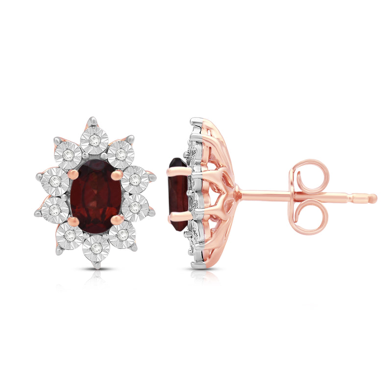 Jewelili 14K Rose Gold Over Sterling Sliver Oval Genuine Garnet and 1/20 CTTW Natural White Round Diamond Cluster Stud Earrings