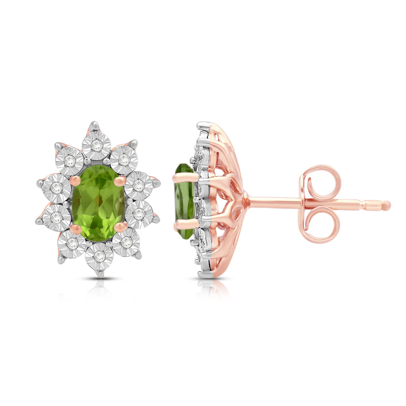 Jewelili 14K Rose Gold Over Sterling Sliver Oval Genuine Peridot and 1/20 CTTW Natural White Round Diamond Cluster Stud Earrings