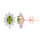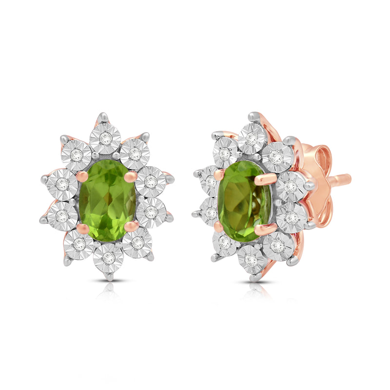 • Load image into Gallery viewer, Jewelili 14K Rose Gold Over Sterling Sliver Oval Genuine Peridot and 1/20 CTTW Natural White Round Diamond Cluster Stud Earrings