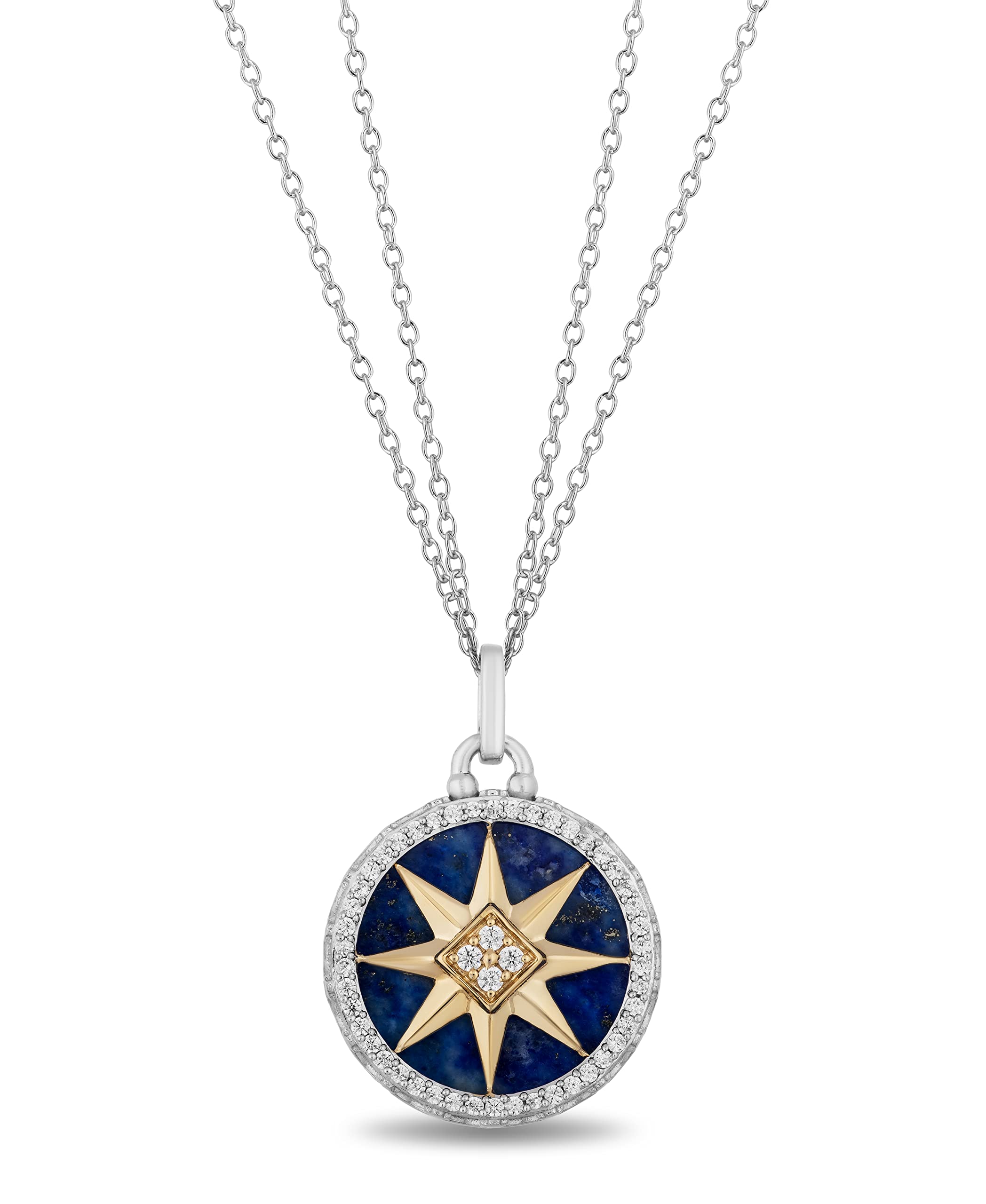 Jewelili 14K Yellow Gold and Sterling Silver 16 MM Lapis Lazuli with 1/4 Cttw Natural White Round Diamond Star Pendant Necklace 18" Cable Chain