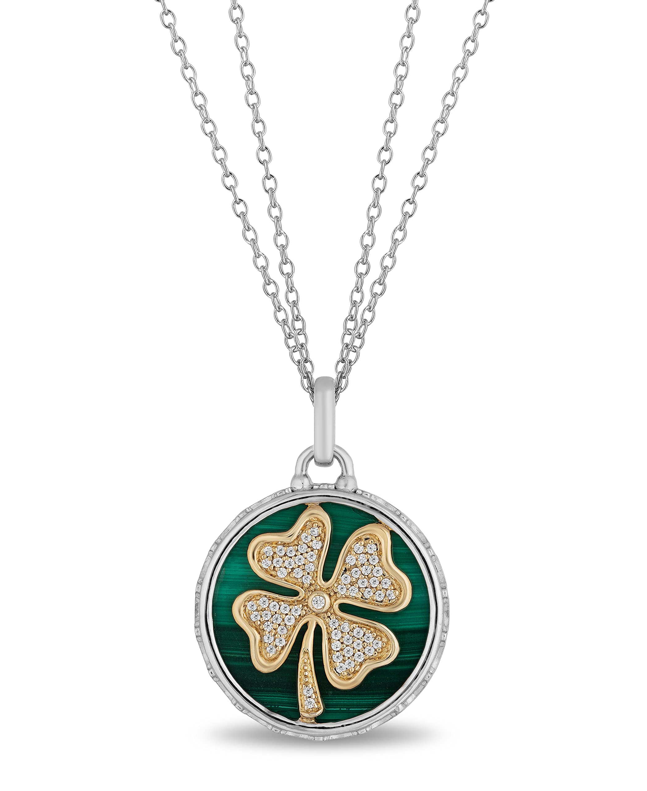 Jewelili 14K Yellow Gold and Sterling Silver 16 MM Malachite with 1/10 Cttw Natural White Round Diamond Clover Pendant Necklace