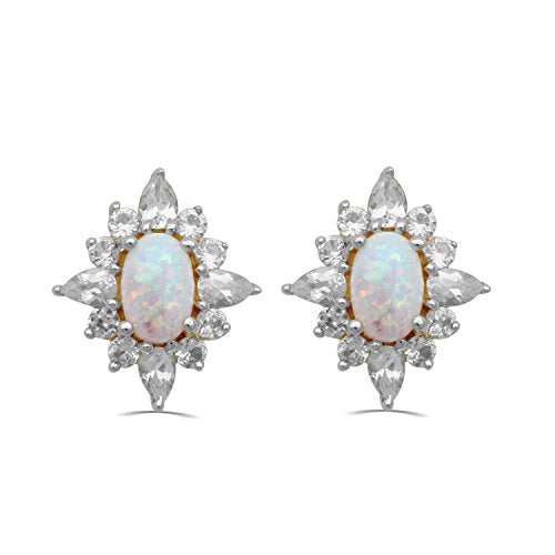 • 6x4mm Oval Created Opal Surrounded by 3x2mm Pear Shaped and 1.75mm Round Shaped Created White Sapphire set in 14K Over Yellow Gold Over Sterling Silver Blooming Earrings. Secured with Butterfly Earnut and Post