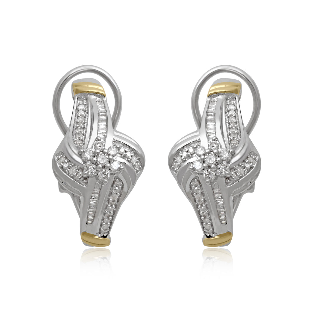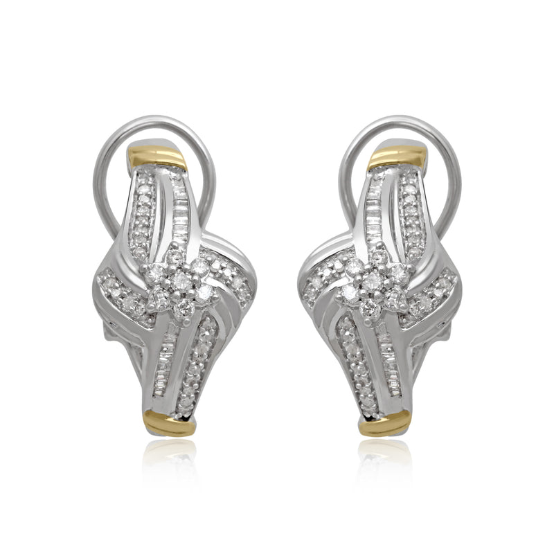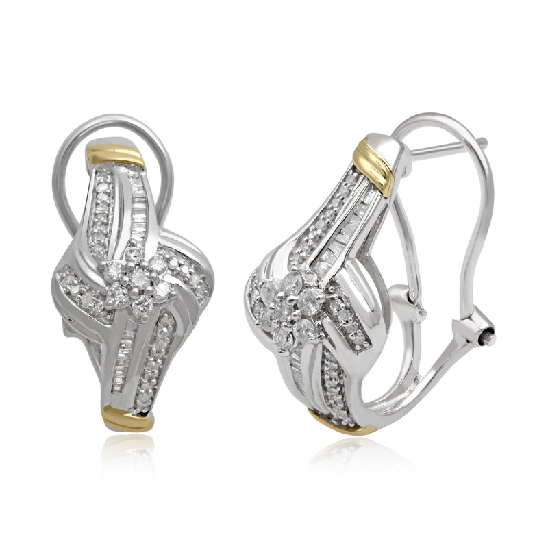 • 1/2 Cttw, Cluster Bypass Twist Earrings in Sterling Silver featuring baguette and round white diamonds in prong and channel setting.