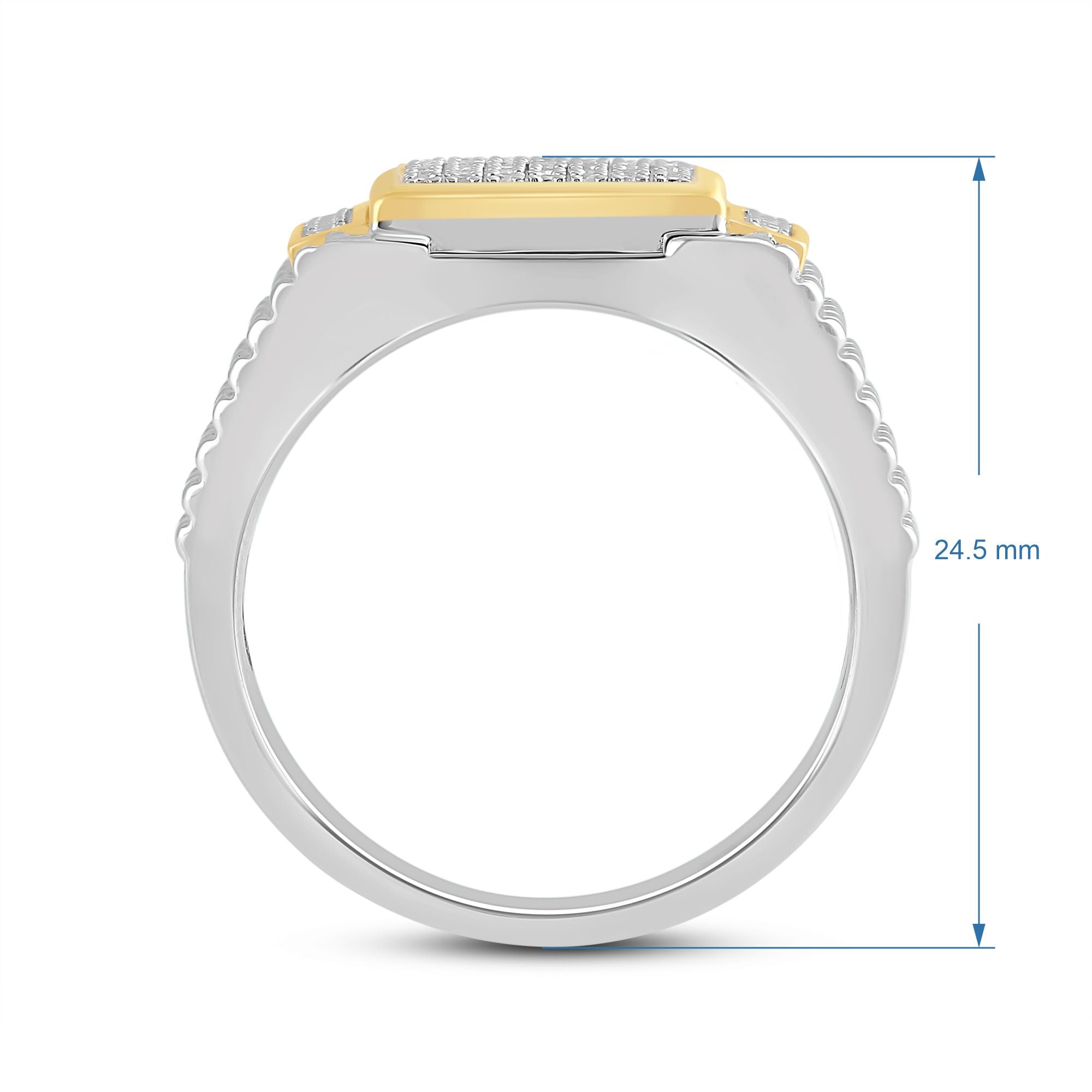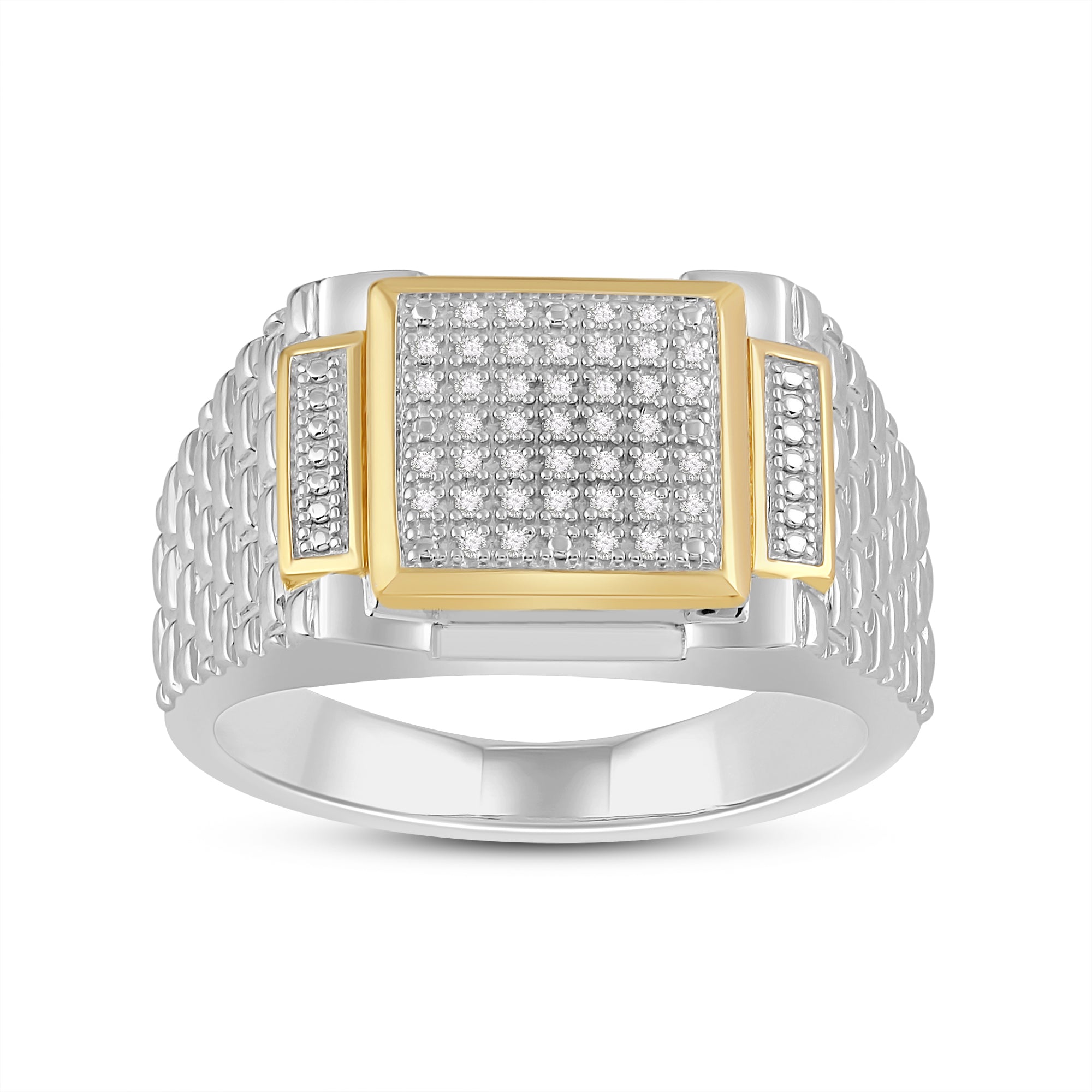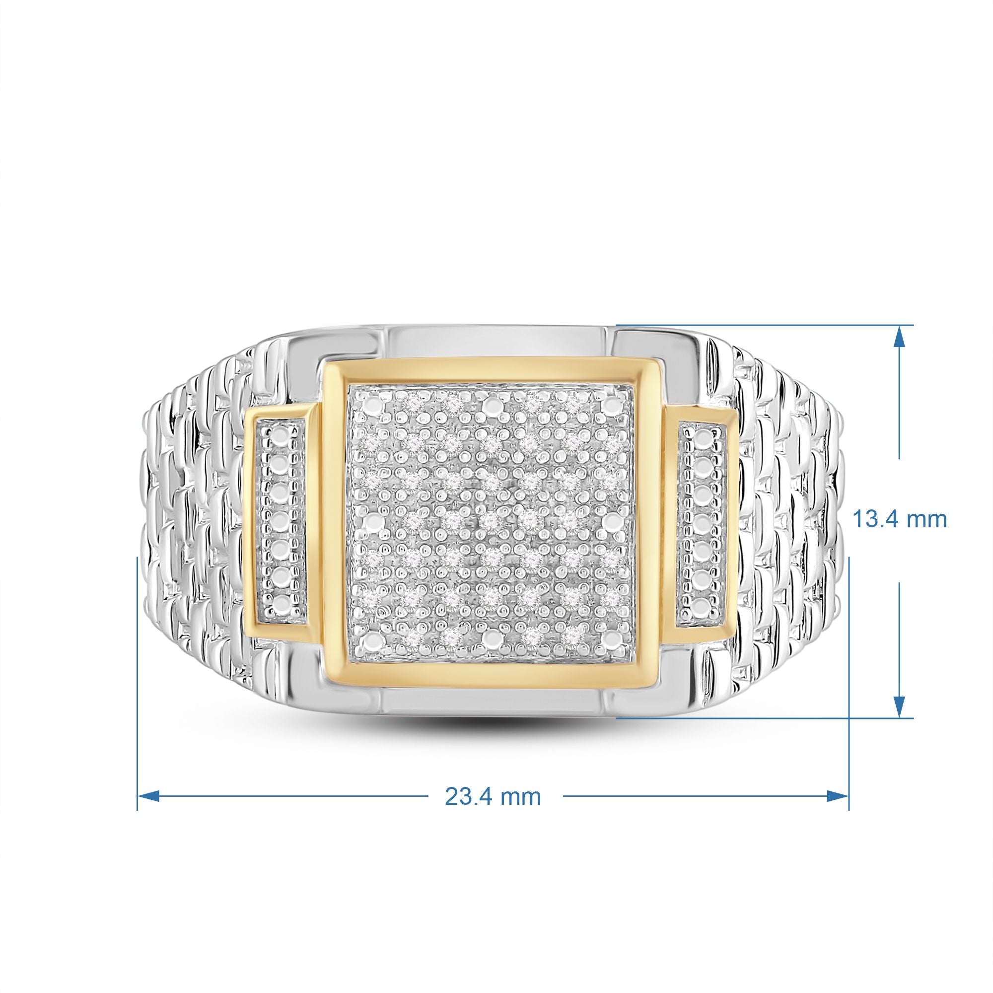 Introducing our unique yellow gold plated silver diamond square texture men's ring - a perfect blend of classic and contemporary style. The intricate square texture design, combined with the brilliance of a diamond, makes this ring a true work of art that will add a touch of sophistication to any outfit. Crafted from high-quality silver, this ring is plated in yellow gold, creating a stunning contrast that will catch everyone's attention.