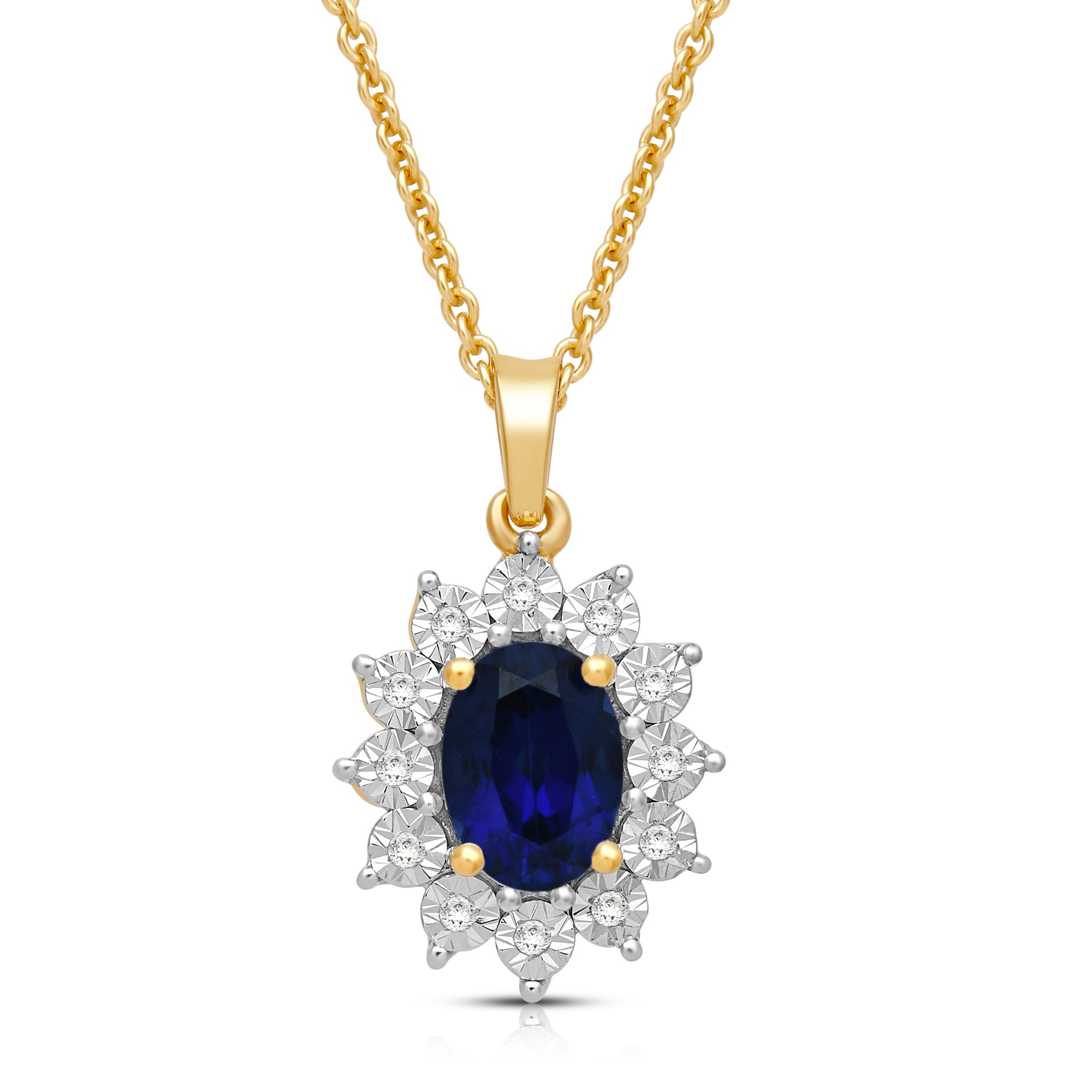 Jewelili 18K Yellow Gold over Sterling Silver 7x5 MM Oval Created Blue Sapphire and 1/20 Cttw Natural White Round Diamond Pendant Necklace