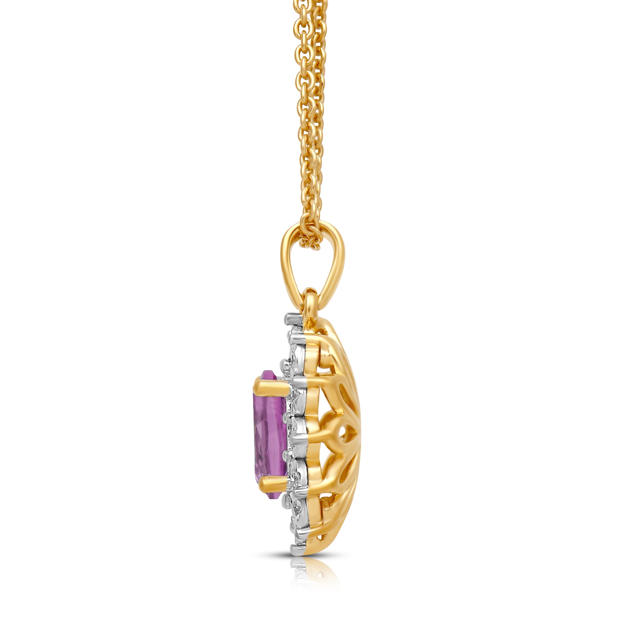 Elevate your style with our exquisite 18K Yellow Gold over Sterling Silver pendant necklace. This stunning piece features a 7x5mm oval-cut Created Pink Sapphire gemstone that exudes warmth and elegance. The vibrant Created Pink Sapphire is perfectly complemented by the brilliance of 1/20 carat total weight natural white round Diamonds. The pendant hangs gracefully from an 18-inch cable chain, allowing it to rest elegantly on your décolletage. The chain is designed for comfort and durability, ensuring that this exquisite piece will be cherished for years to come.
