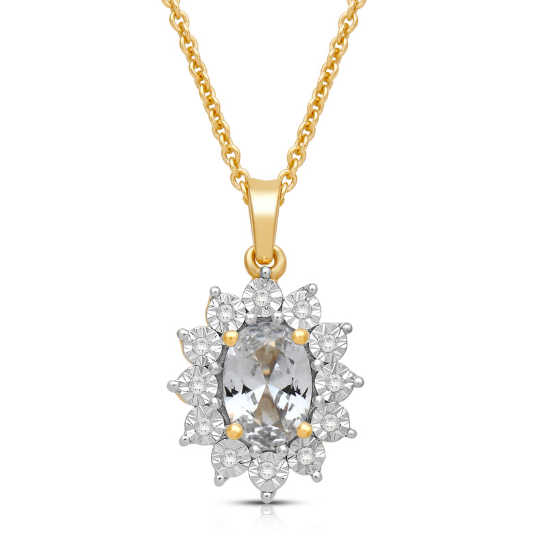 Elevate your style with our exquisite 18K Yellow Gold over Sterling Silver pendant necklace. This stunning piece features a 7x5mm oval-cut Created White Sapphire gemstone that exudes warmth and elegance. The vibrant Created White Sapphire is perfectly complemented by the brilliance of 1/20 carat total weight natural white round Diamonds. The pendant hangs gracefully from an 18-inch cable chain, allowing it to rest elegantly on your décolletage. The chain is designed for comfort and durability, ensuring that this exquisite piece will be cherished for years to come.
