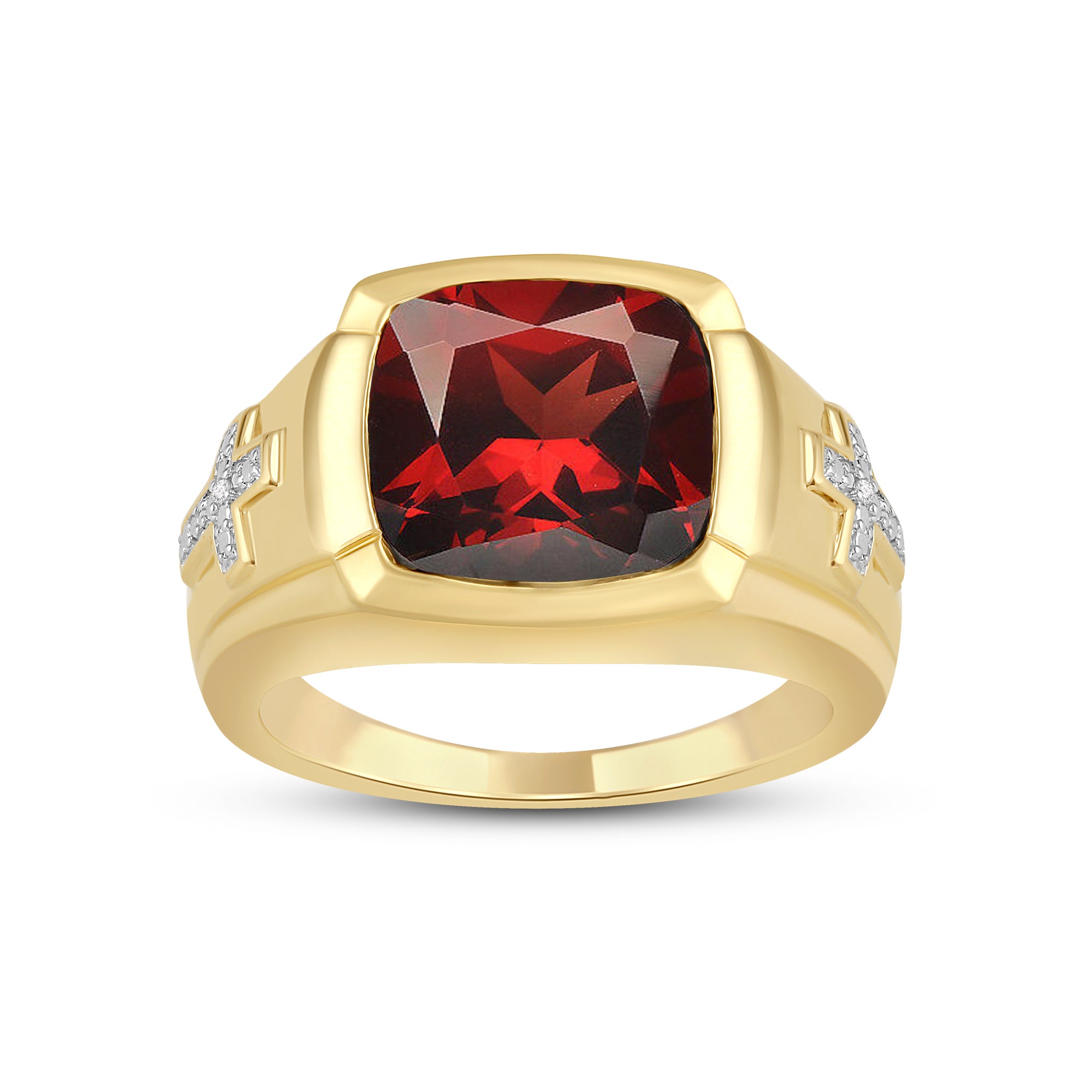 This men's ring features a cushion-cut garnet gemstone set in yellow gold over sterling silver, accented by 0.01 carat total weight of natural white round diamonds for added elegance and sophistication.