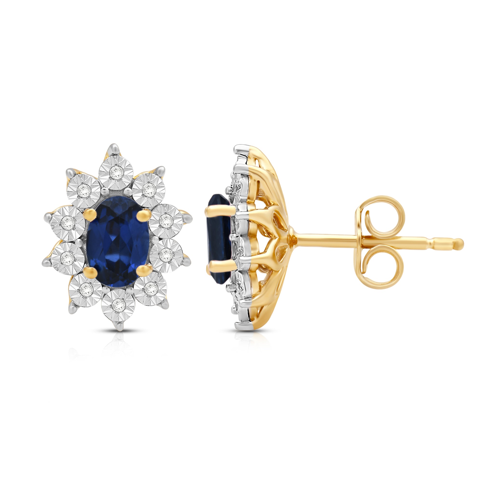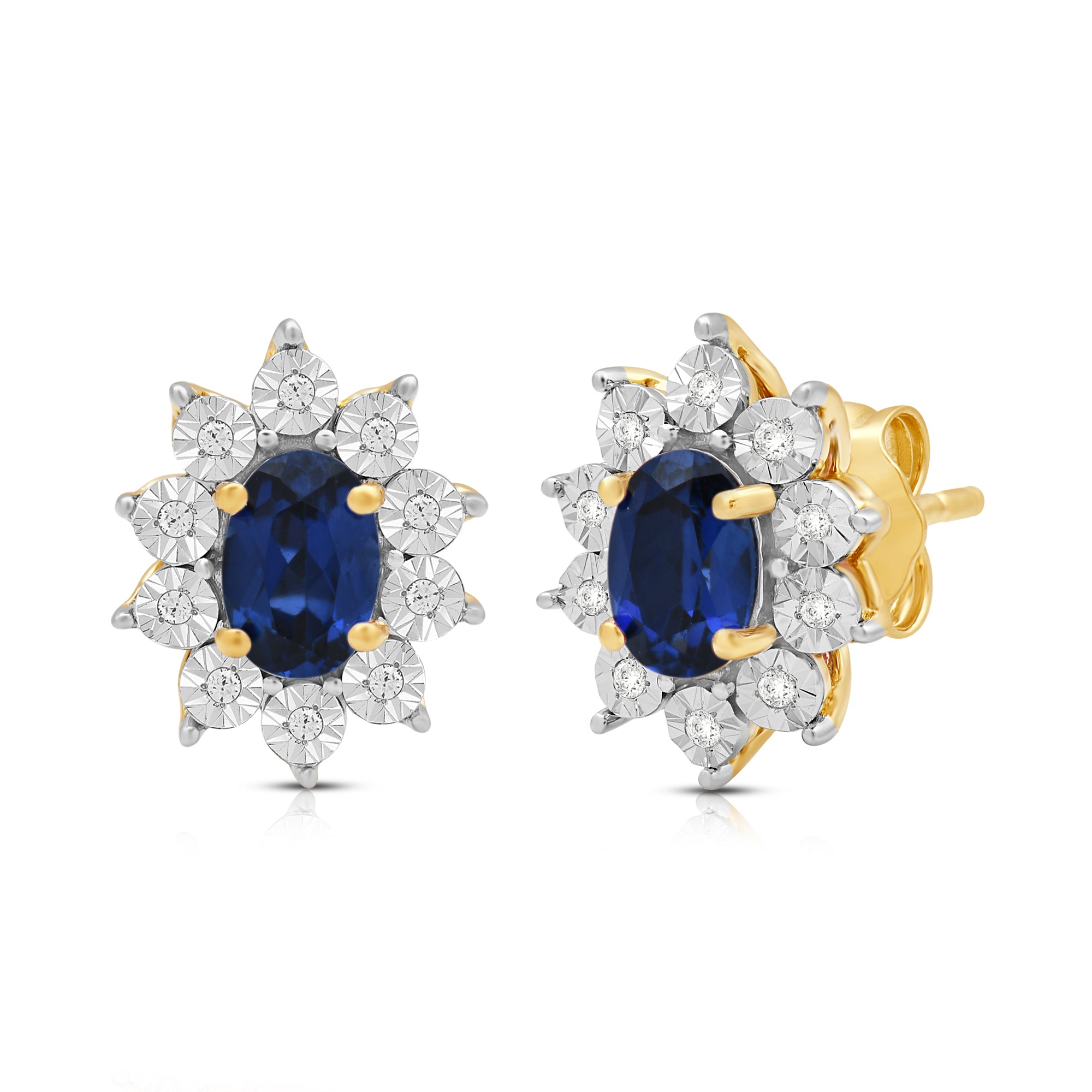 Elevate your style with our exquisite 18K Yellow Gold over Sterling Silver cluster stud earrings. Each earring features a 6x4mm oval Created Blue Sapphire gemstone, surrounded by a delicate cluster of 1/20 carat total weight natural white round Diamonds. The captivating blend of yellow gold and sterling silver enhances the allure of these earrings, creating a luxurious and sophisticated look. These earrings are the perfect addition to any ensemble, adding a touch of elegance and brilliance to both formal occasions and everyday wear.