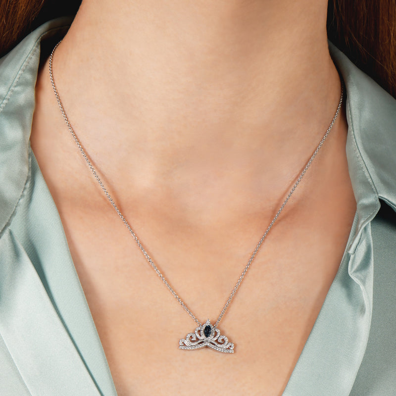 Adorned with a gem that represents eternal romance, here is a piece of fine jewelry perfect for the love of your life. Let her know how important she is in your life with this Cinderella-inspired tiara necklace from the Enchanted Disney Fine Jewelry Collection. It is crafted from sterling silver, decorated with 1/4 cctw diamonds plus London Blue topaz gemstones. Your lady will surely love the intricate design balanced by a soothing blend of white diamond and blue topaz sparkle.