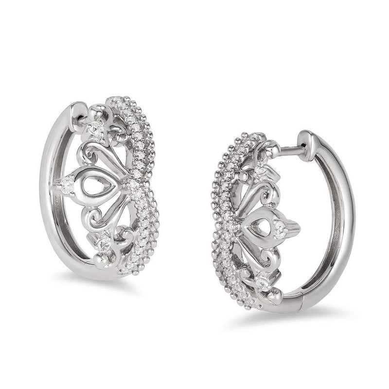 A princess jewelry for the love of your life. These Enchanted Disney Fine Jewelry Tiara Earrings will clearly let your beloved know that she's appreciated, loved and special. Ready to make her feel like a true royal, these earrings in sterling silver feature a tiara sculpture with a band of 1/5 cttw of round radiant diamonds. The earrings are secured with lever-back ear wires that provide a snug hold.