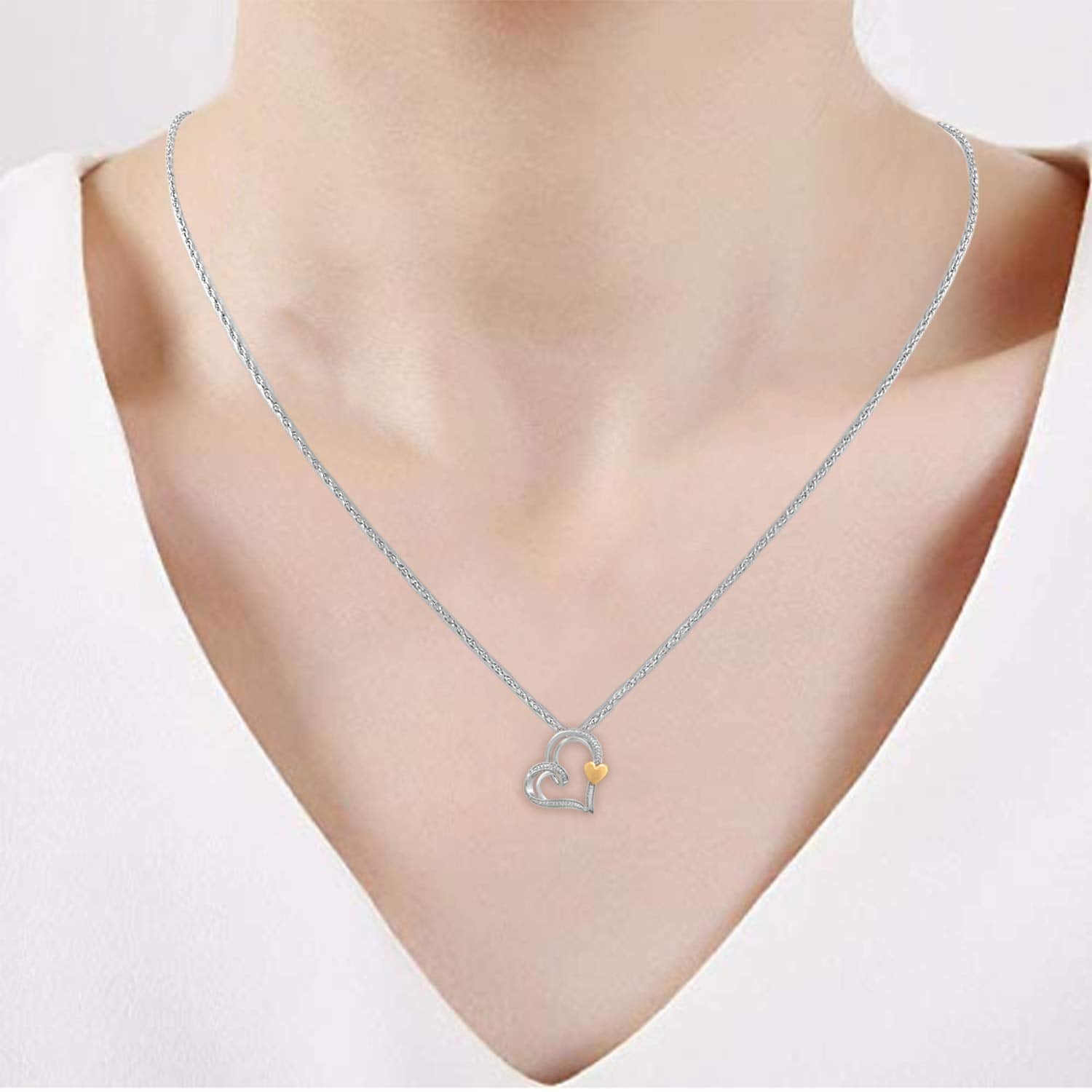 • Heart Shape Pendant Necklace in Sterling Silver and 10K Yellow Gold Natural White Round Diamond Accent
