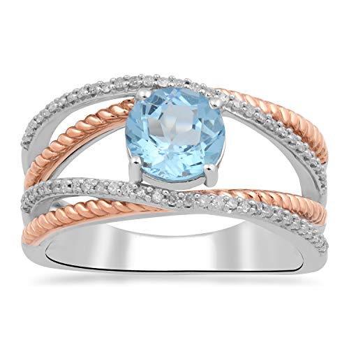 Jewelili Rose Gold Over Sterling Silver With 1/5 CTTW London Blue Topaz and Natural White Round Diamonds Ring