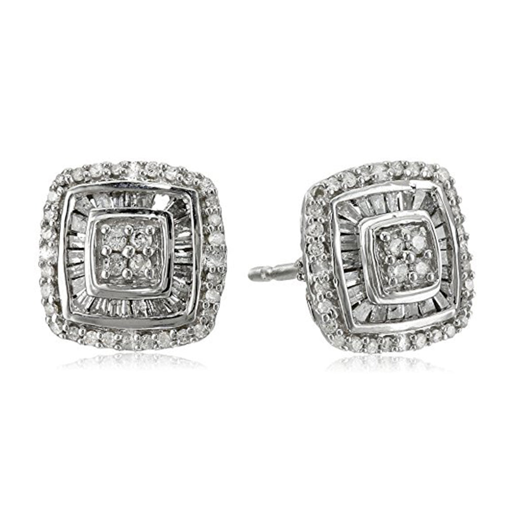 Jewelili Sterling Silver 1/2 CTTW Natural White Round and Baguette Diamonds Cushion Stud Earrings