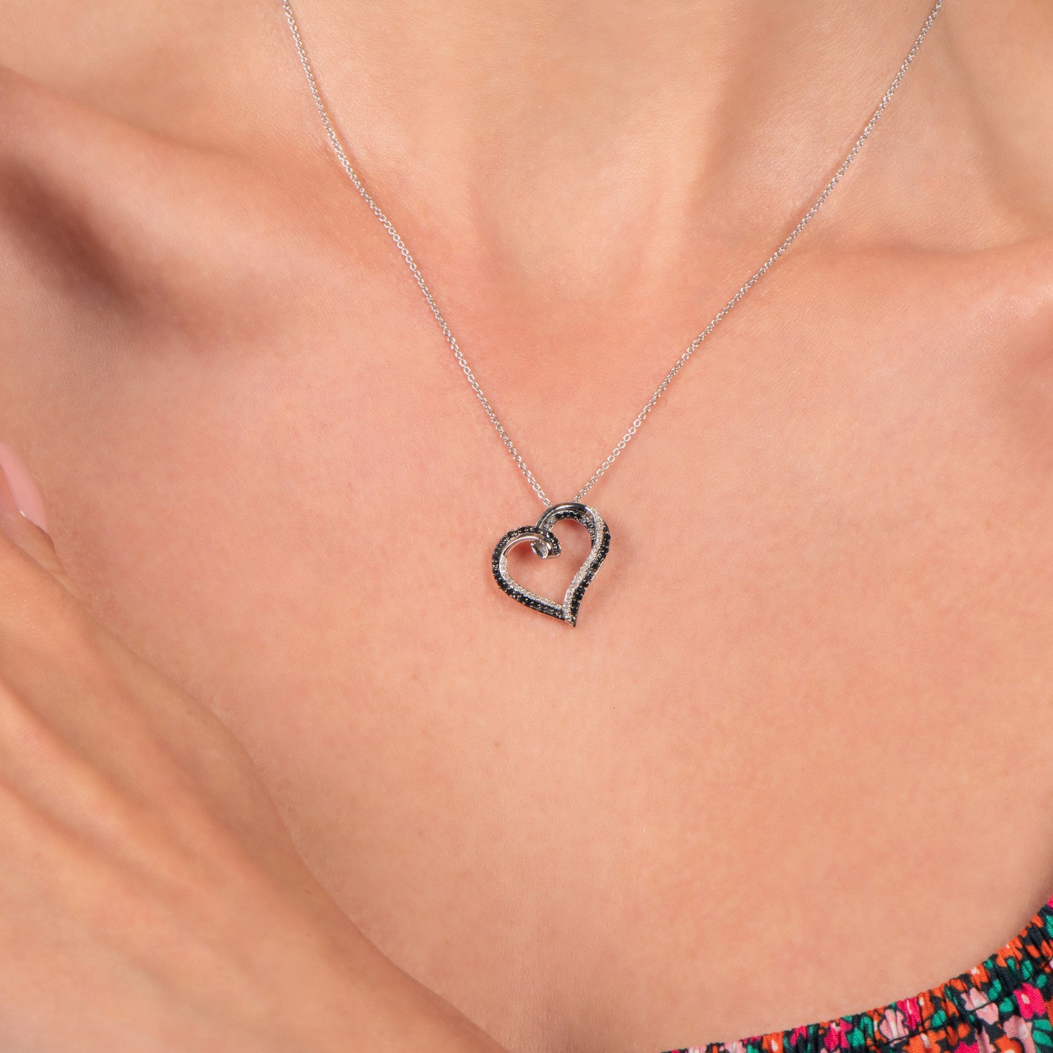 Jewelili Sterling Silver 1/3 CTTW Treated Black Diamonds and White Diamonds Tilted Heart Pendant Necklace