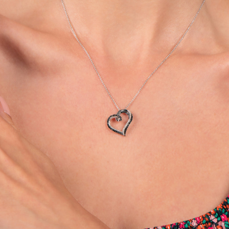 • Sterling Silver 1/3 Cttw Treated Black Diamond and White Diamond Tilted Heart Pendant Necklace