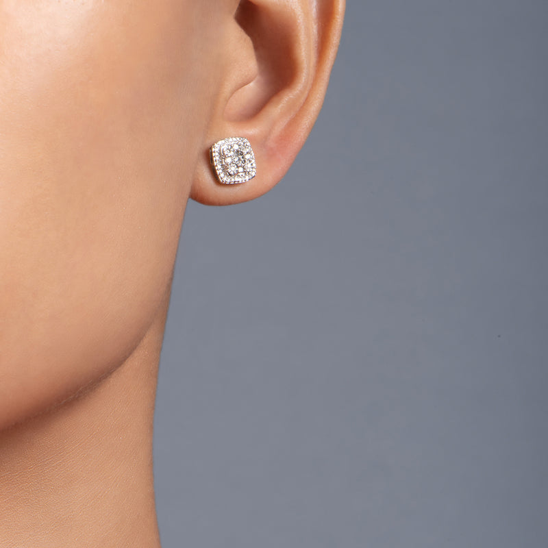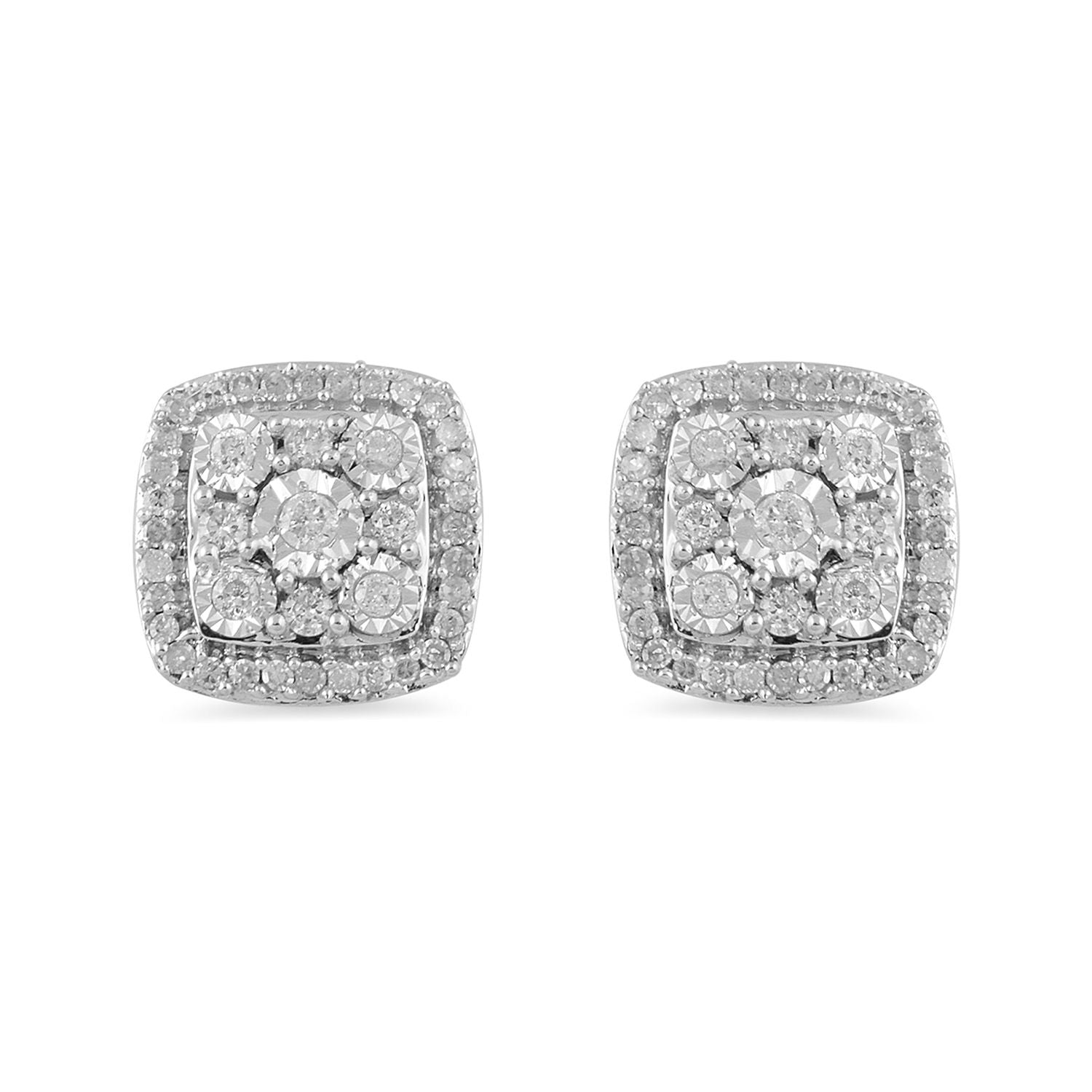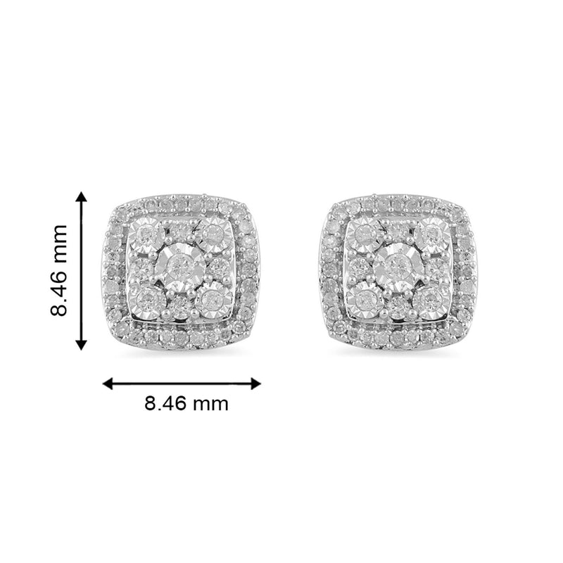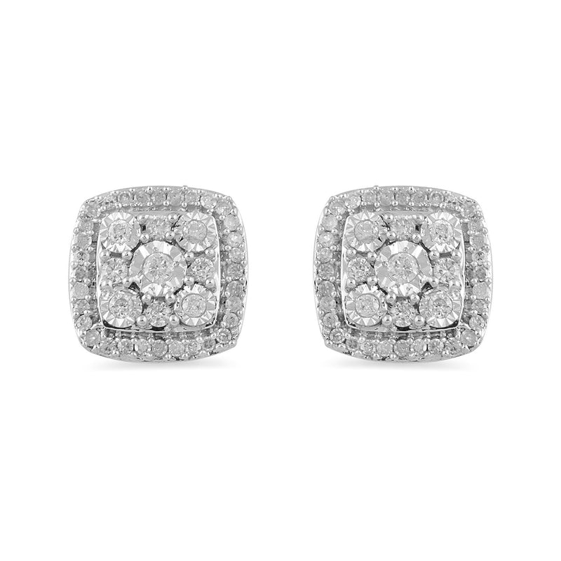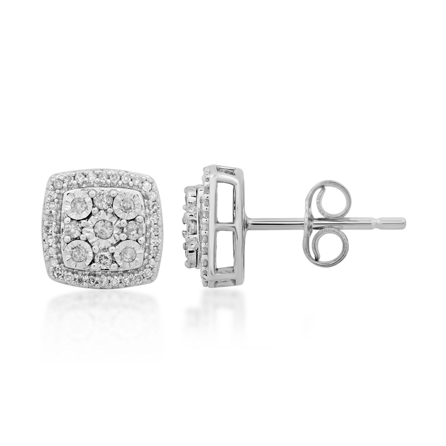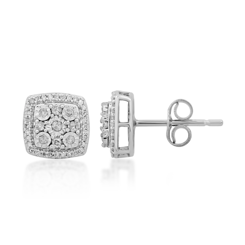 • Sterling Silver 1/4 CT Natural White Round Diamond Cushion Shape Cluster Stud Earrings