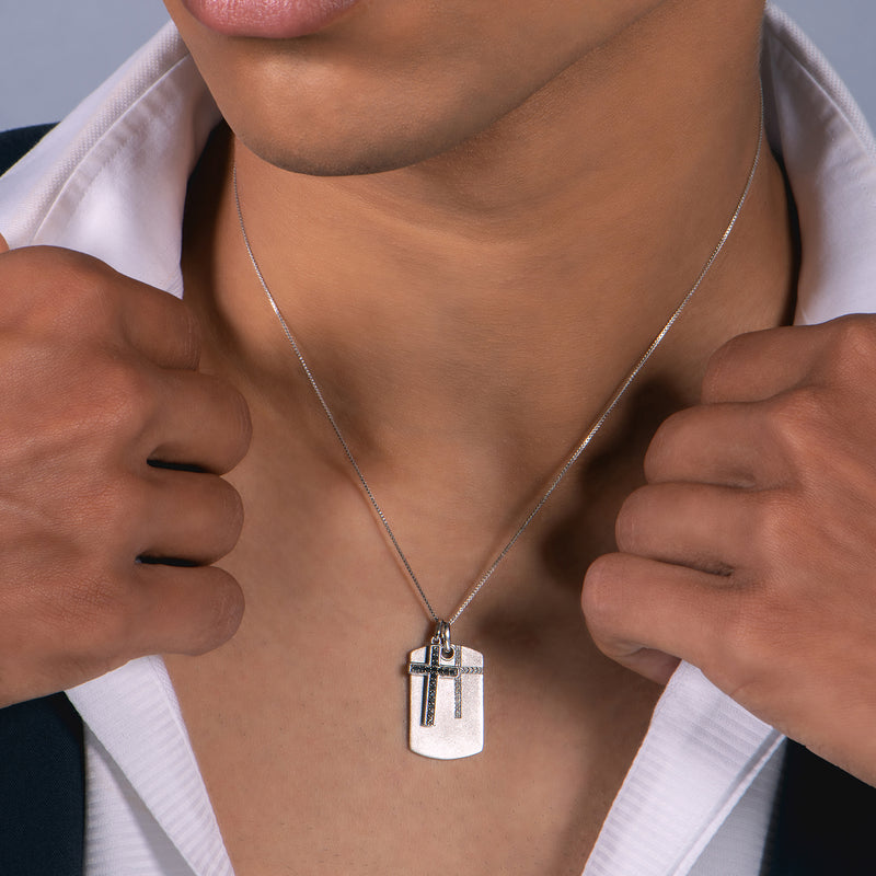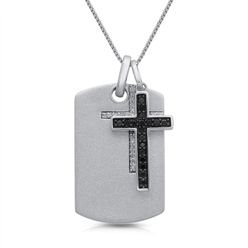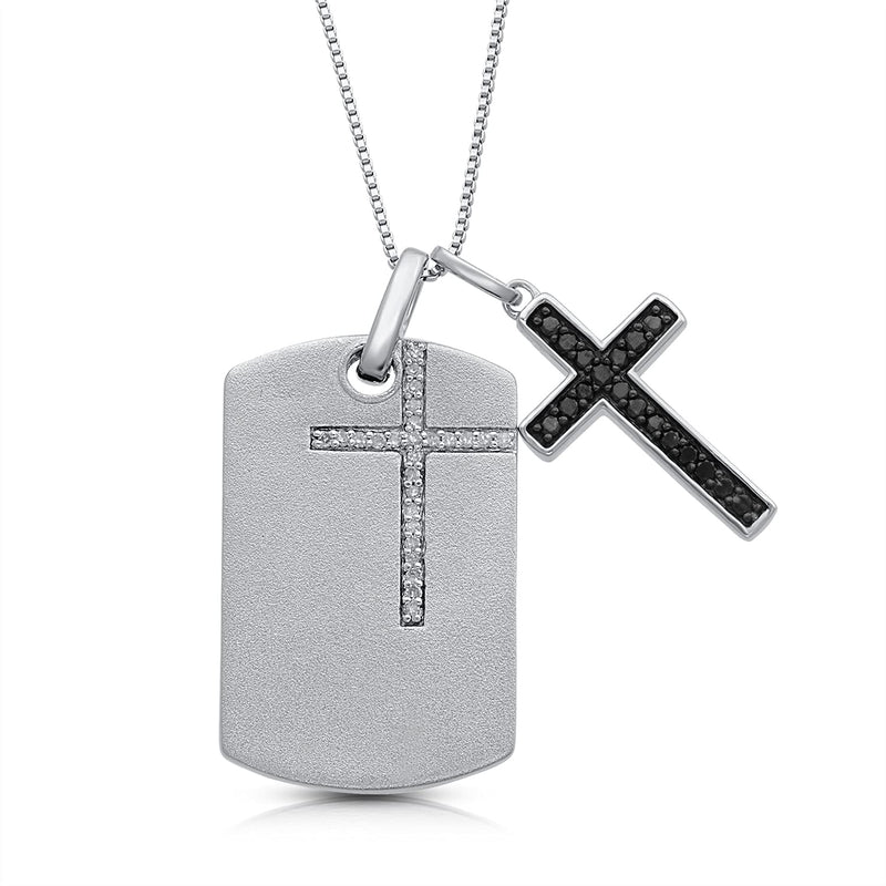 Jewelili Sterling Silver With 1/5 CTTW Treated Black Diamonds and Natural White Round Diamonds Mens Dog Tags Cross Pendant Necklace