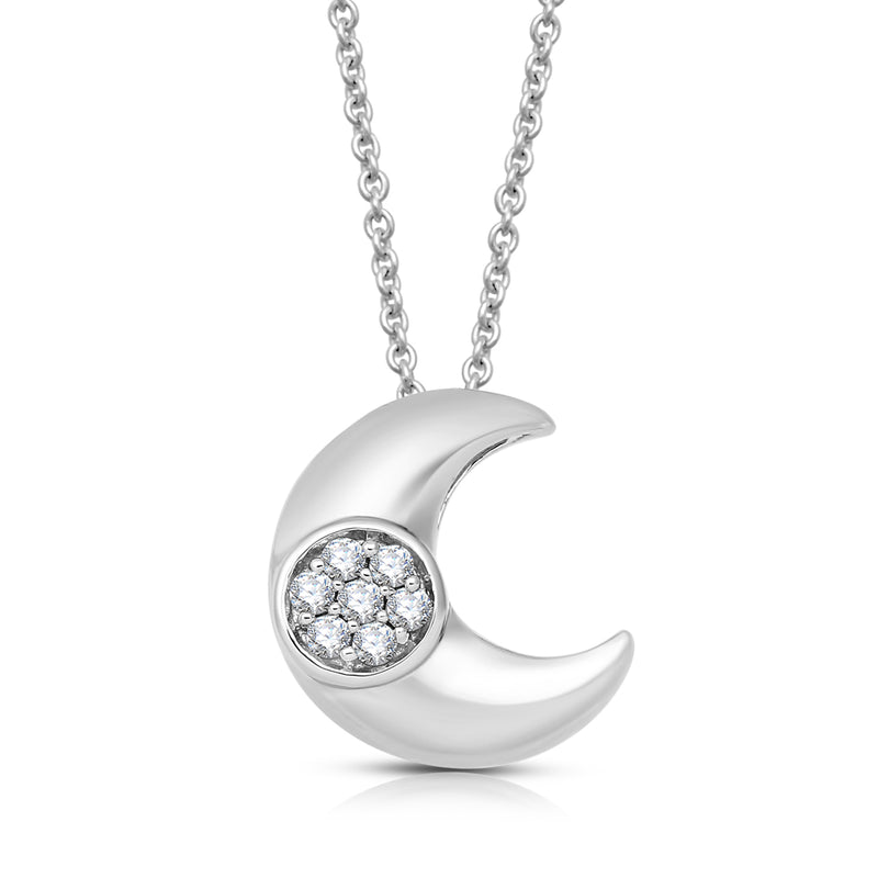 • Moon Pendant Necklace in Sterling Silver with 1/8 Cttw Natural White Round Diamond, 18" Rolo Chain