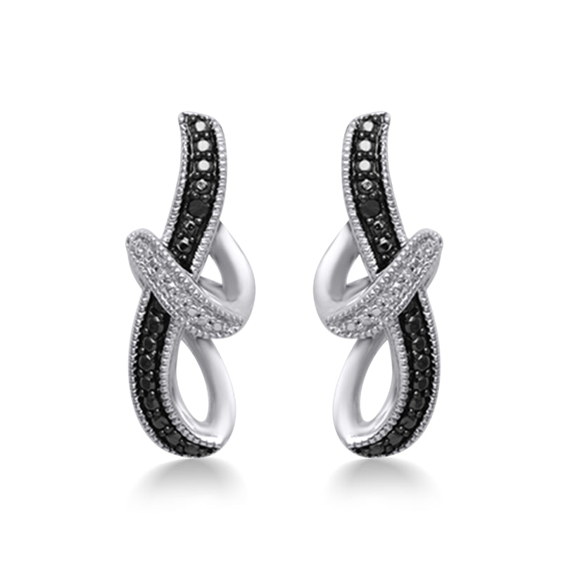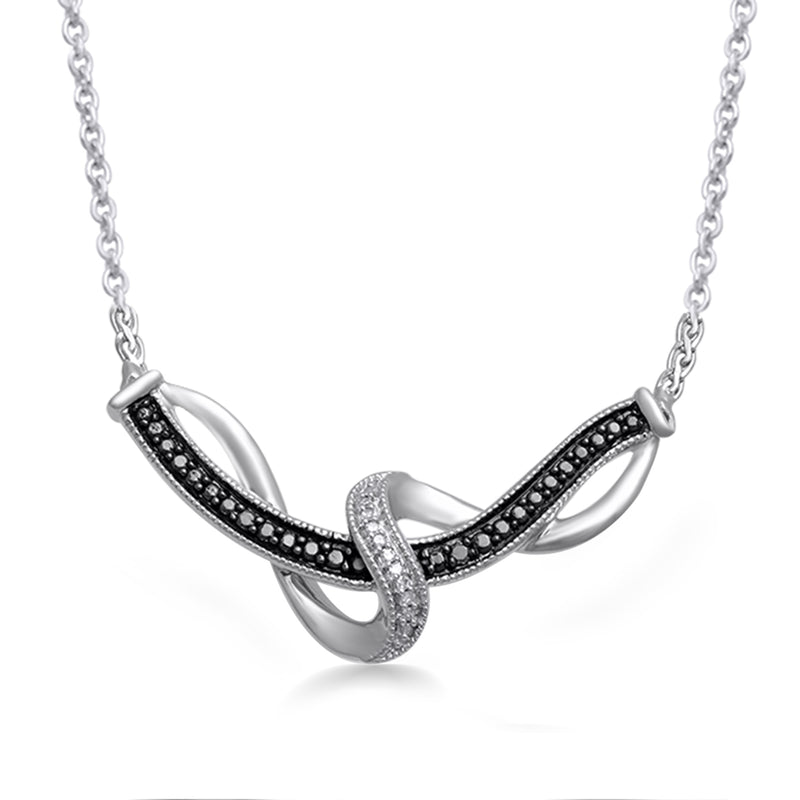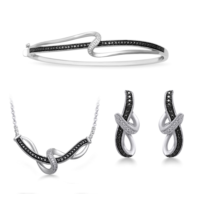 Jewelili Sterling Silver With 1/8 CTTW Round Treated Black and Natural White Round Diamonds Necklace, Earrings and Bangle Jewelry Set