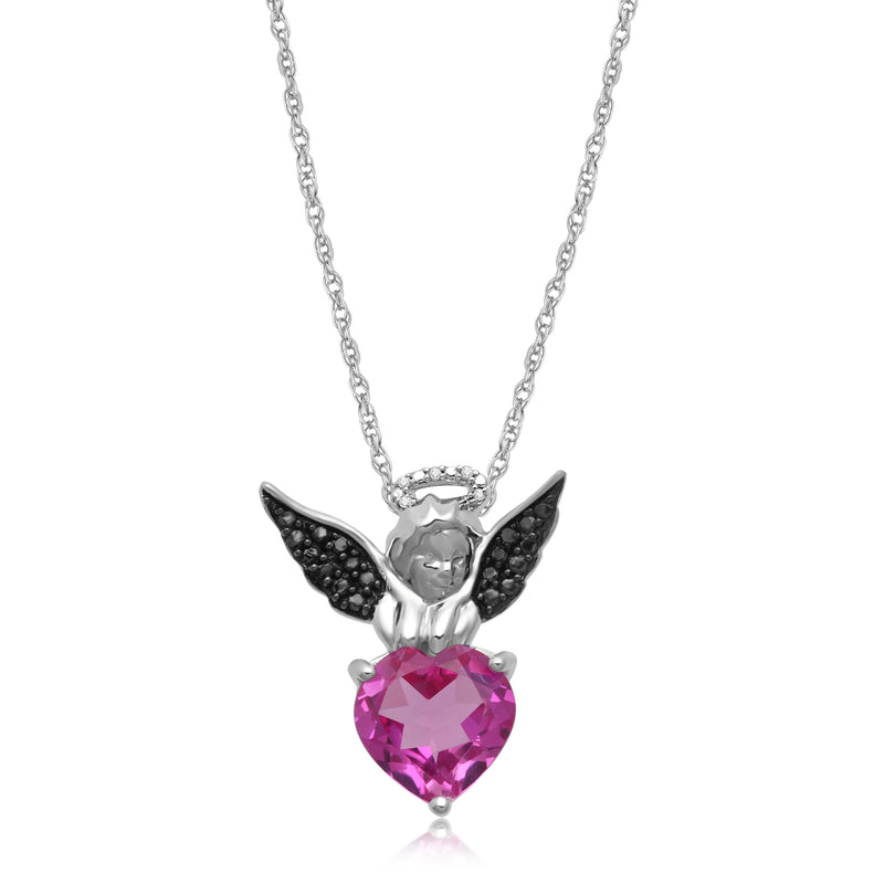 • Heart Angel Wing Pendant Necklace, 18” with Sterling Silver 10mm Created Pink Sapphire with Treated Black and Natural White Diamond Accent