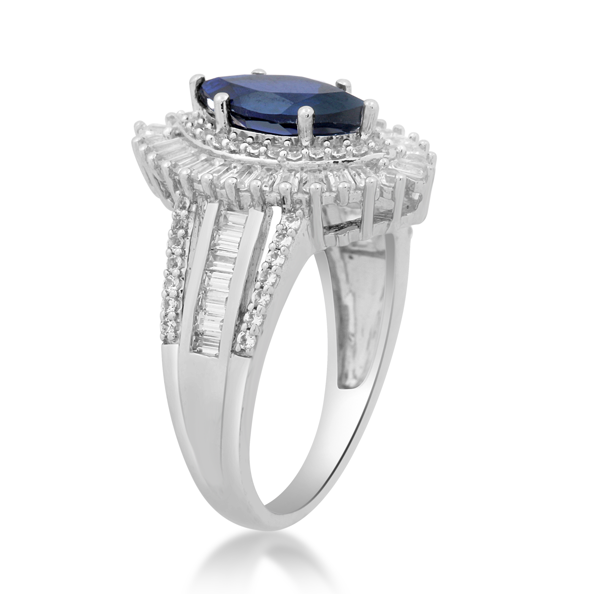 Details: Sterling Silver 10x5mm Marquise Created Blue Sapphire with Round and Baguette shape Created White Sapphire Cocktail Ring, Size 6