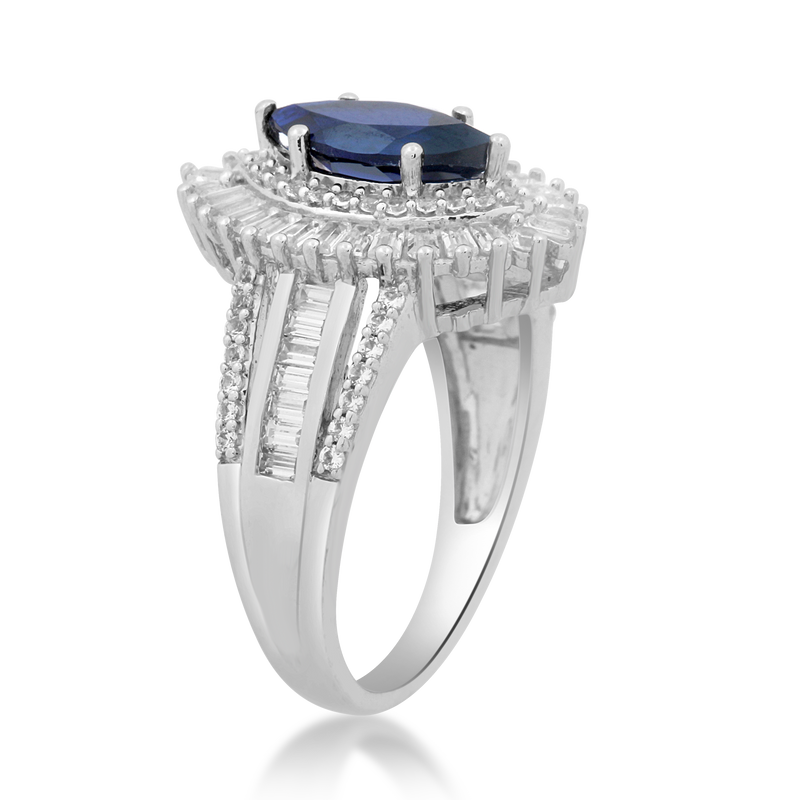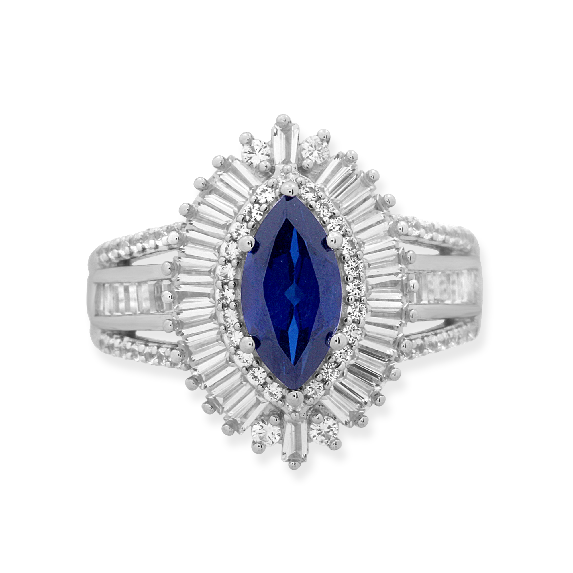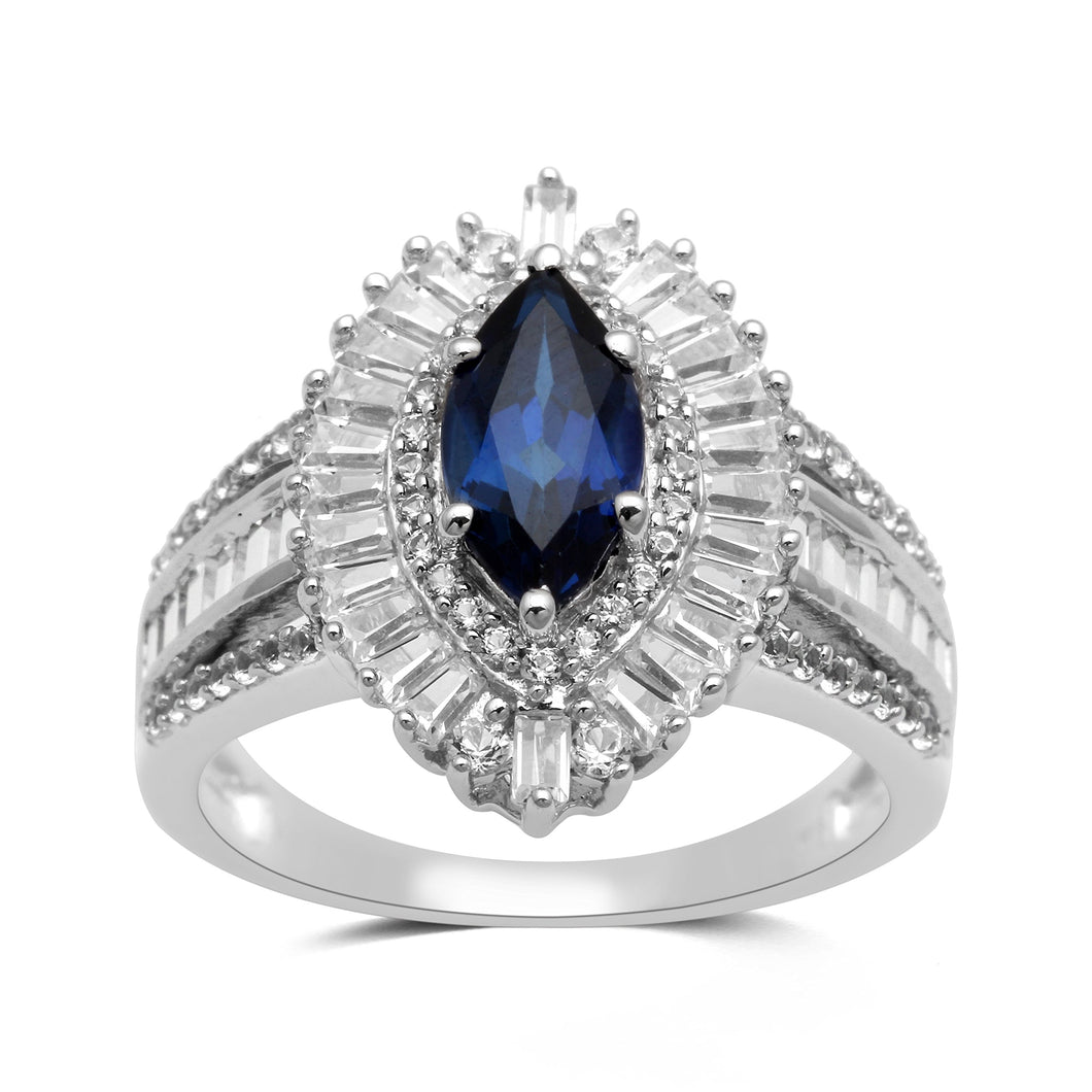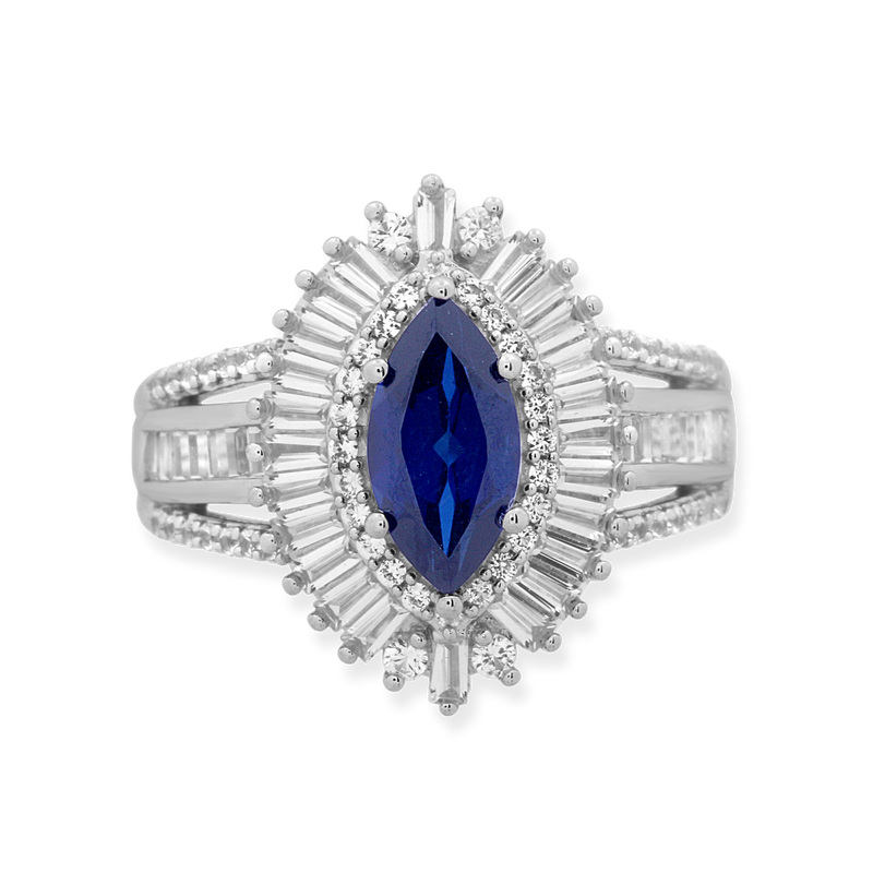 • Fashion Cocktail Ring Featuring 10x5mm Marquise shape Created Blue Sapphire in the center enhanced with Round and Baguette Shape Created White Sapphire in Sterling Silver