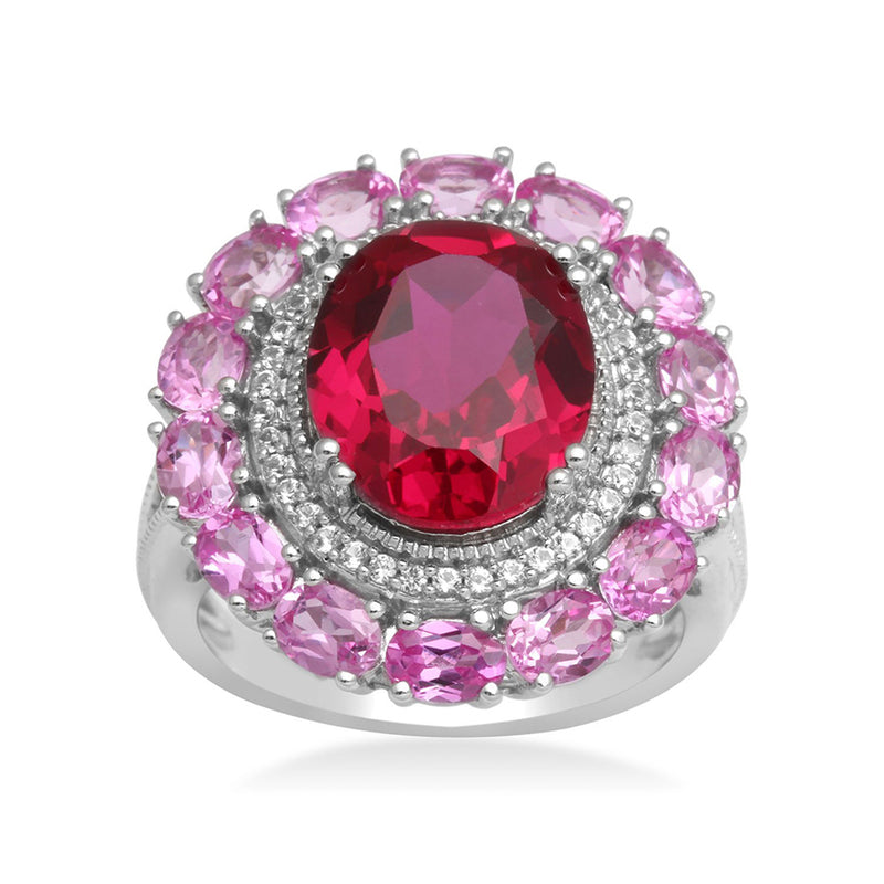 • Sterling Silver with Oval Created Ruby Framed with Round Created White Sapphire and Oval Pink Sapphire Halo Ring