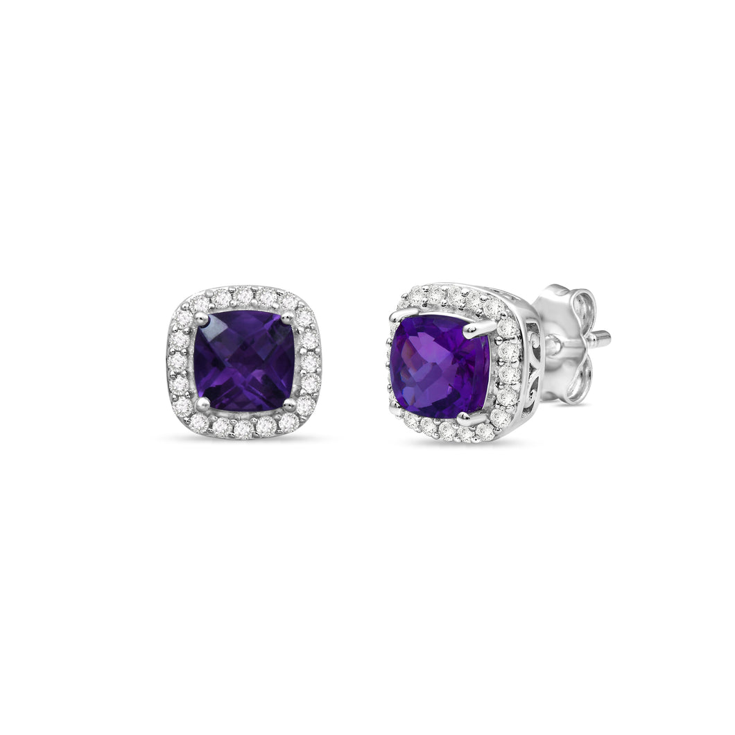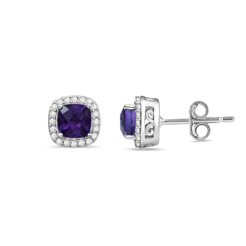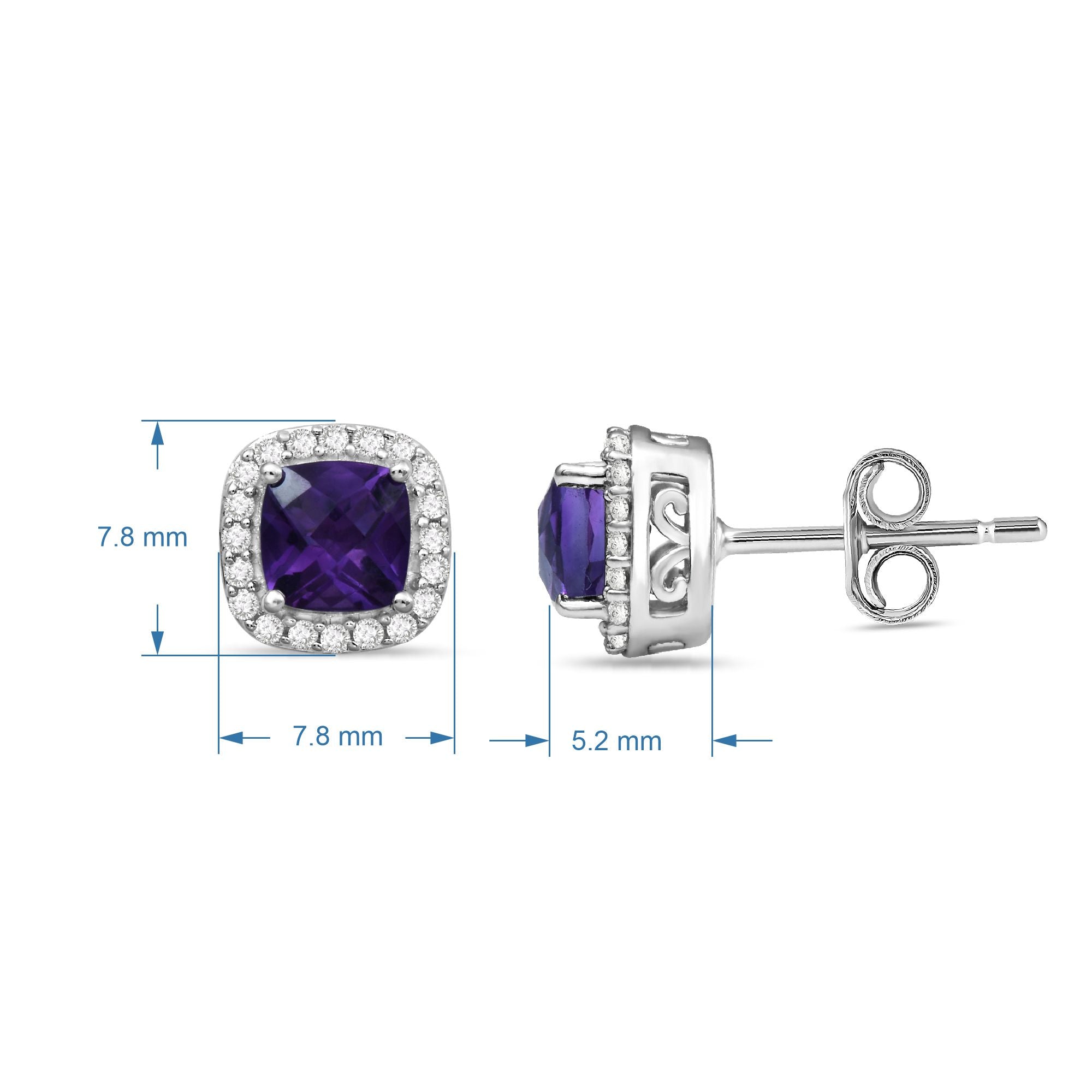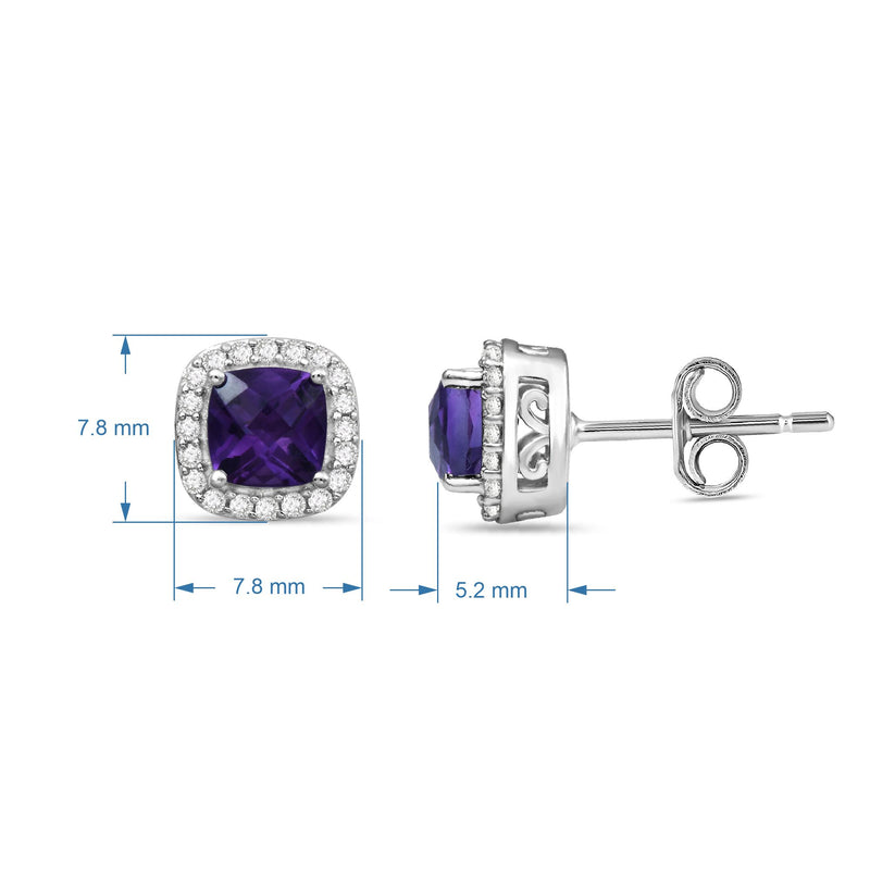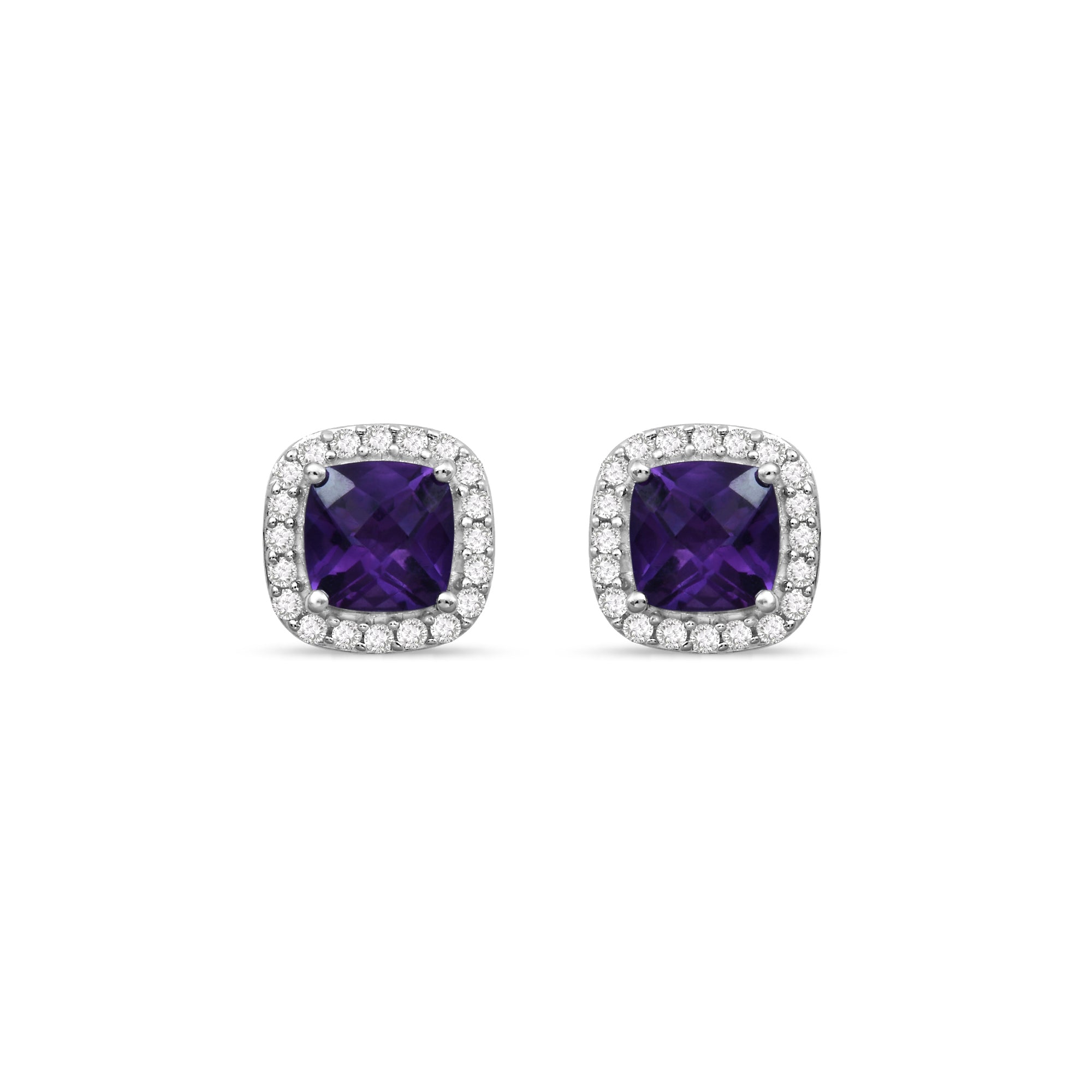 Adorn yourself with elegance: Sterling Silver 5x5 MM Cushion Cut Amethyst Stud Earrings. Framed by a halo of White Sapphires, these timeless studs bring sophistication in a 5x5 MM size. Perfect for daily wear or special occasions, they arrive in an elegant gift box. Elevate your style effortlessly.