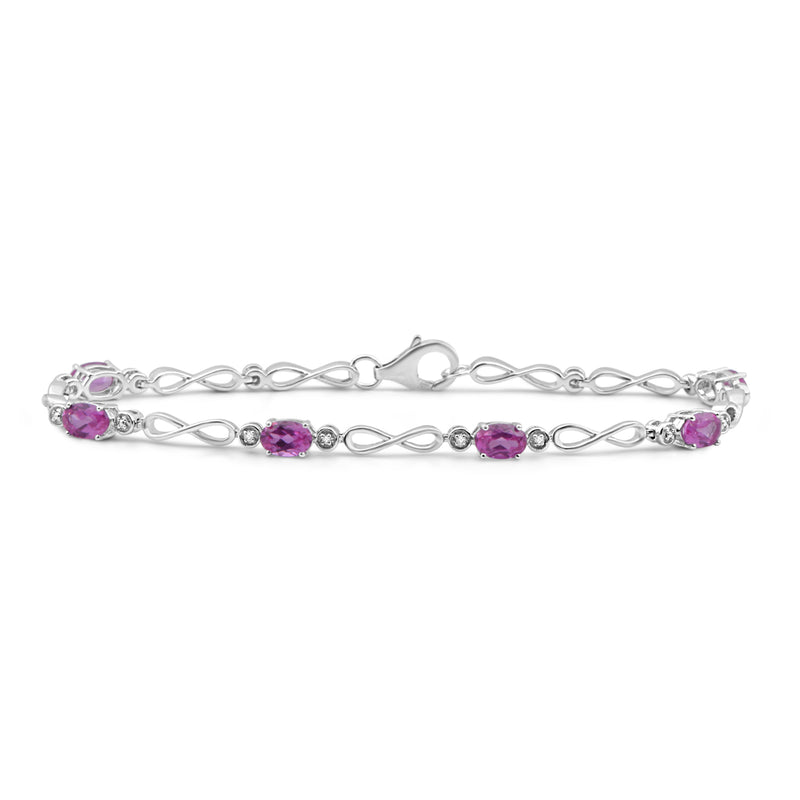 • Link Bracelet in Sterling Silver with 6x4 MM Oval Created Pink Sapphire and Natural White Round Diamond Accent