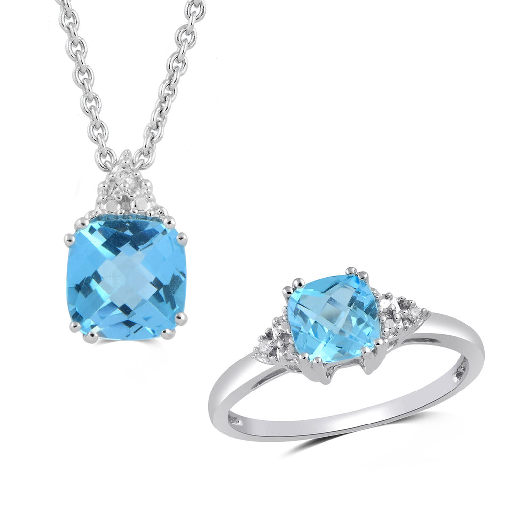 • Load image into Gallery viewer, Jewelili Diamond Ring and Pendant Jewelry Set Checkerboard Cushion Swiss Blue Topaz and Natural White in Sterling Silver Jewelry View 1