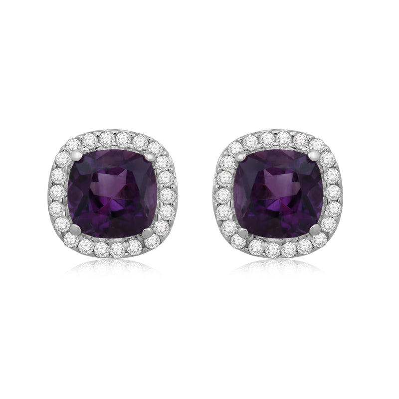 • Cushion Sterling Silver Earrings Prong Set with 7mm Cushion Cut Amethyst and Round Created White Sapphire.