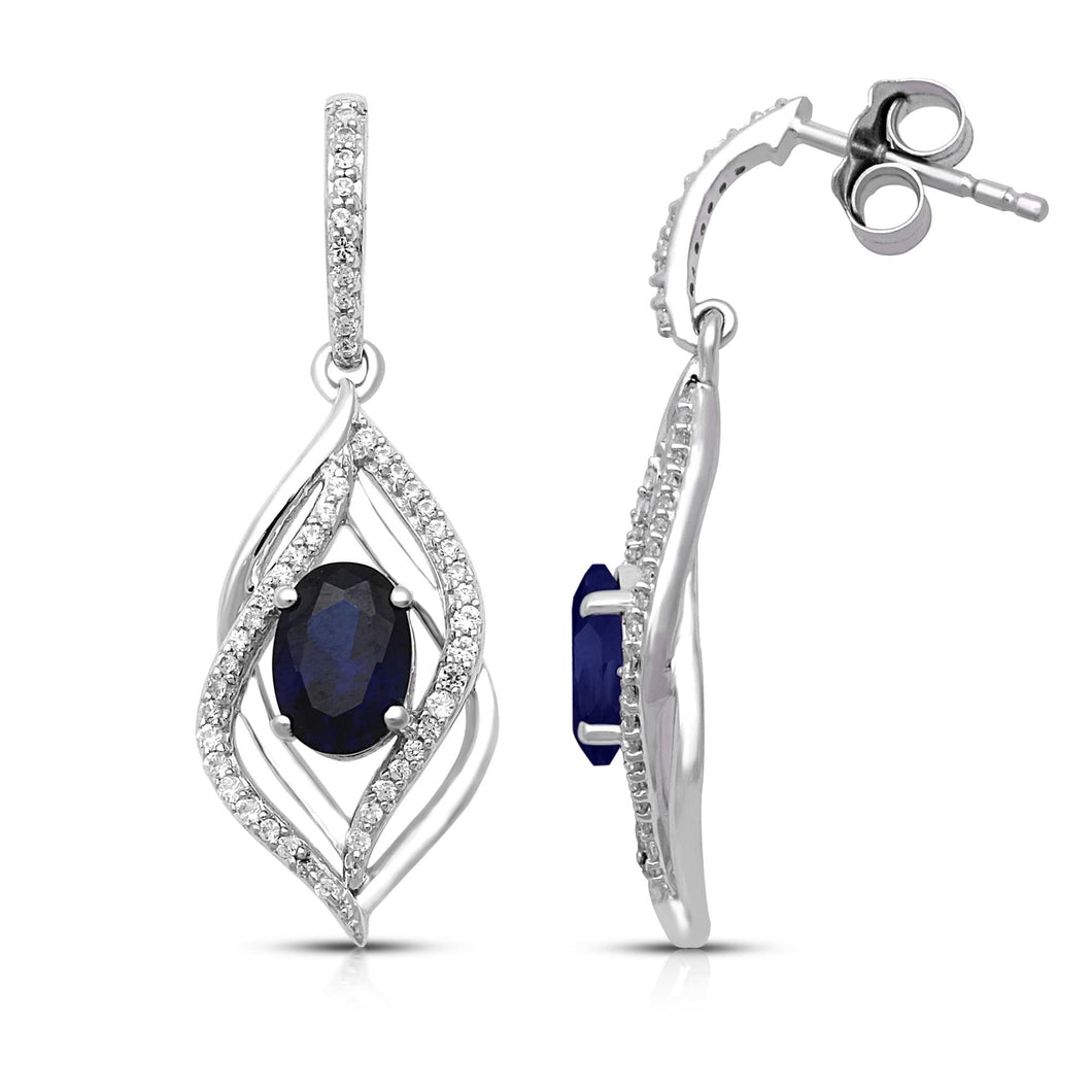 • Dangle Earrings in Sterling Silver with 7x5 MM Oval Created Blue Sapphire and Round Created White Sapphire