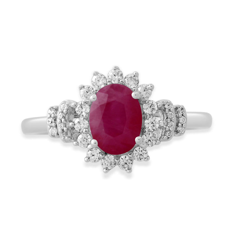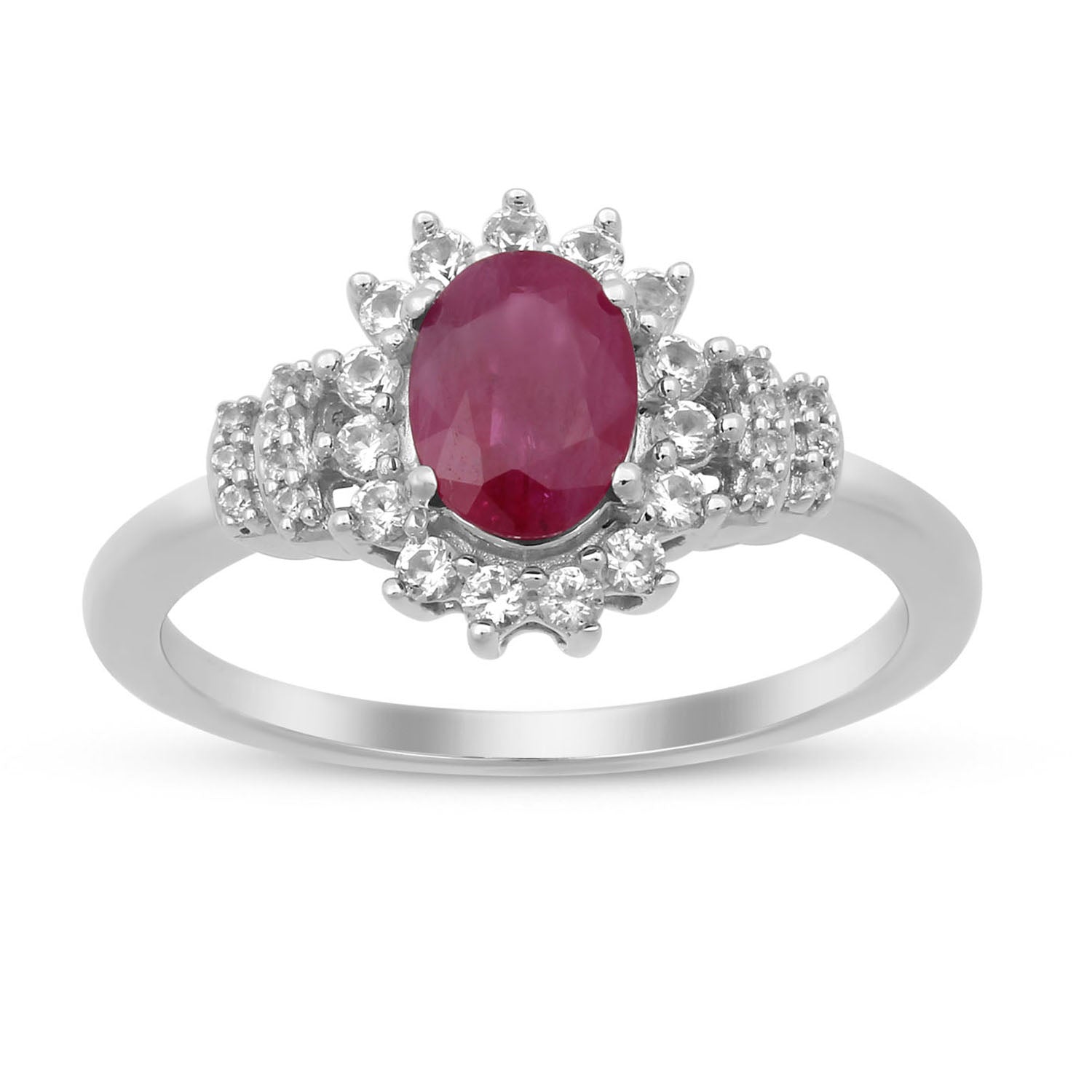 Jewelili Sterling Silver 7x5 MM Oval Created Ruby and Round Created White Sapphire Cluster Ring