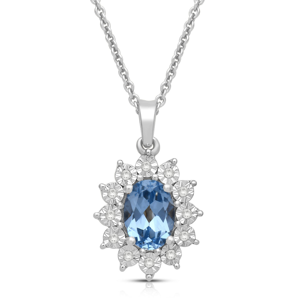 Jewelili Sterling Silver 7x5 MM Oval Genuine Swiss Blue Topaz and 1/20 Cttw Natural White Round Diamond Pendant Necklace