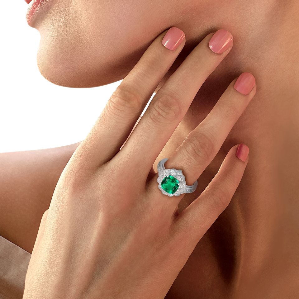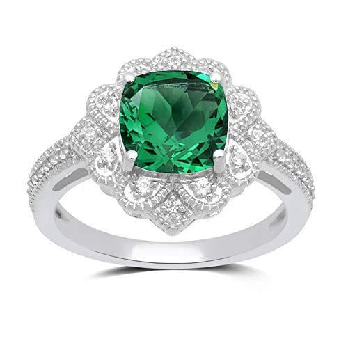 • sterling silver 8 x 8 mm cusion shape created emerald and 1/6 cttw white diamond ring