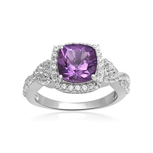 Jewelili Sterling Silver with Cushion Cut Amethyst and Created White Sapphire Halo Ring
