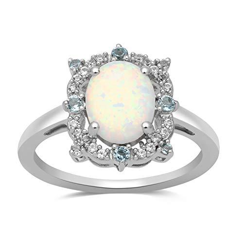 Jewelili Sterling Silver with Created Opal with Swiss Blue Topaz and Created White Sapphire Halo Ring