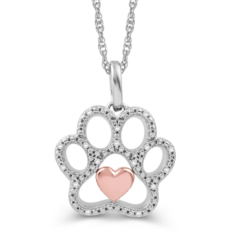 • Sterling Silver and 10K Rose Gold Natural White Round Diamonds Paw Heart Pendant Necklace