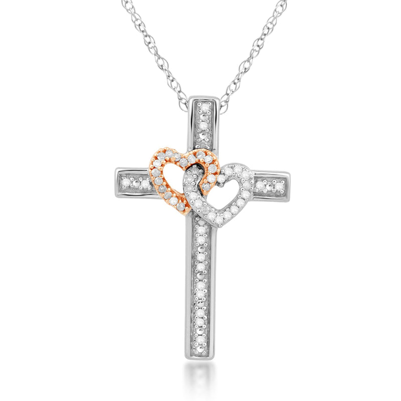 Jewelili Sterling Silver and 10K Rose Gold With 1/10 CTTW Diamonds Double Heart Cross Pendant Necklace