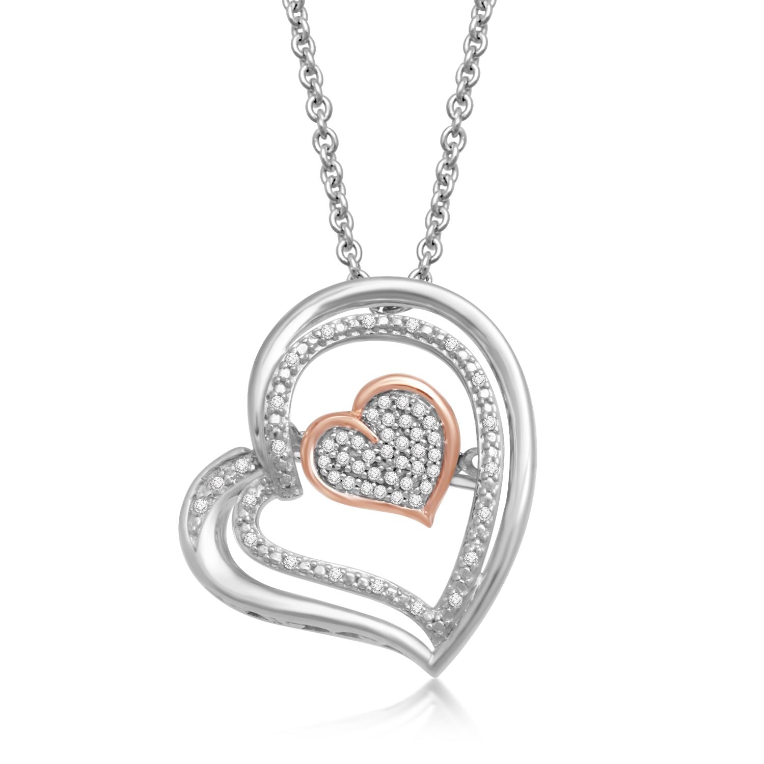 Jewelili Sterling Silver and 10K Rose Gold With 1/10 CTTW Diamonds Two Tone Heart Pendant Necklace
