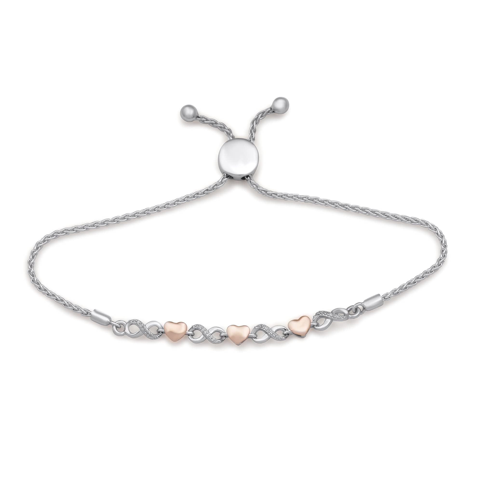 Jewelili Sterling Silver and 10K Rose Gold With Natural White Round Diamonds Infinity and Heart Shape Bolo Bracelet, 9.5"